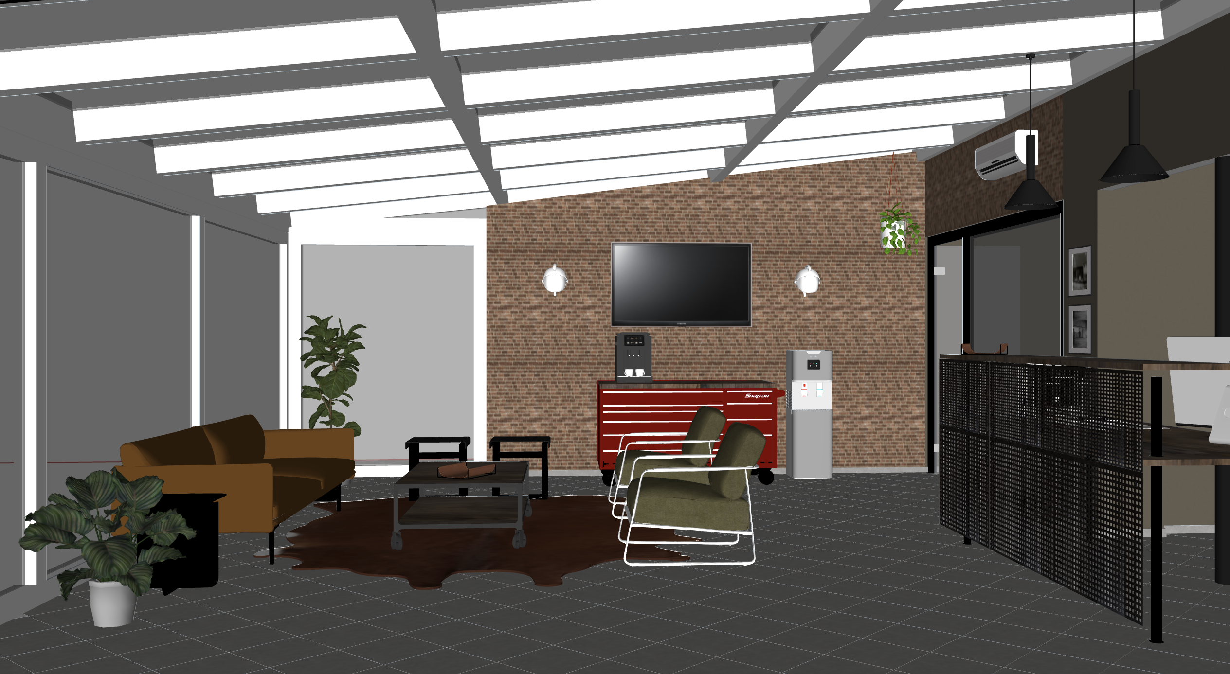 exterior shot el mood es mid century industrial loft vibe convierte este modelo 3d en un render de alta calidad con un acabo hiperrealista manteni ndotela fiel tanto al modelados original no cambies ning n detalle de geometr a y dise o respeta la geometr a y dise o original ceiling y windows tienen un acabo mate metal blanco con vidrio la pared al lado de la pared de ladrillos tambi n es metal blanco con vidrio el acabado de la pared es ladrillo expuesto el piso es gris matte the sconces son en metal las sillas son en soft green velvet con detalles en silver metal matte tiene un cow rug que cubre el sofa la mesa de centro y las sillas esta es marr n la mesa de centro y la mesa de recepci n es una mezcla de madera r stica con metal r stico negro la entrada a la oficina al lado de la recepci n es puerta de vidrio con frame negro los stools detr s de la mesa de centro son una mezcla de cuero negro con madera negra la pared de la recepci n donde no tiene ladrillo expuesto es un deep brown matte asegurate de agregar un environment en el exterior de una calle con vegetaci n veh culos y personas caminando dim las lamparas en un tono c lido y que enfoque la iluminaci n es mitad de la tarde alrededor de las 3 pm
