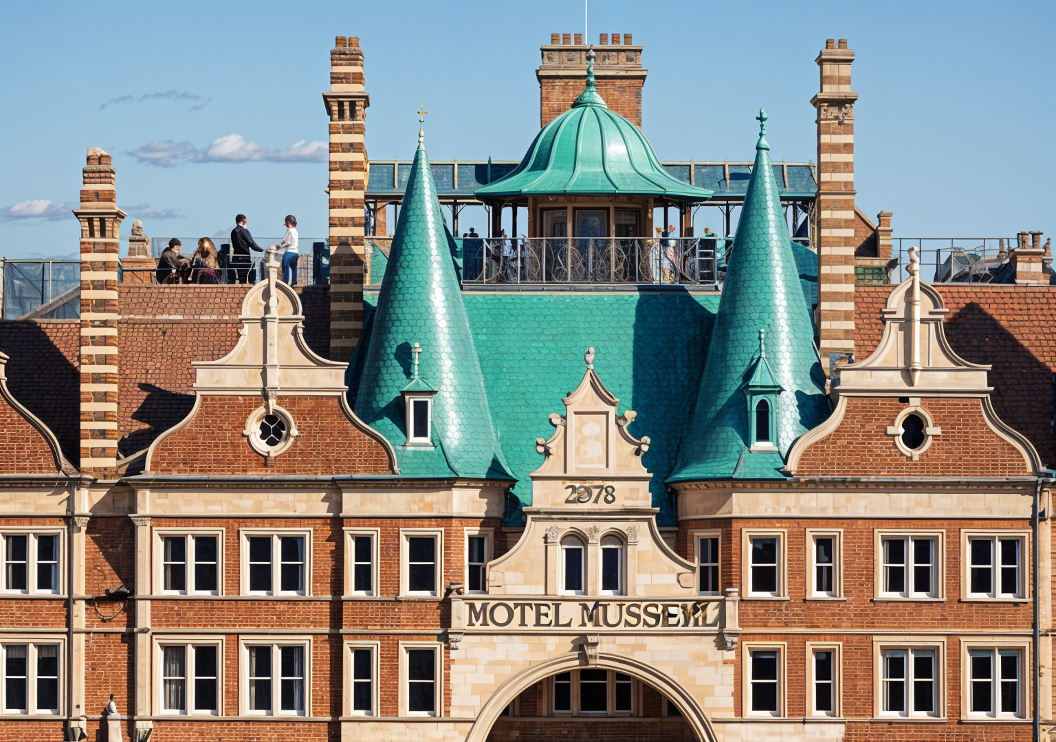 wall directly behind turquoise green fish scale tiled spired turrets is a lead mansard and the domed roof is lead there is no terrace for people to the left of the spire chimney
