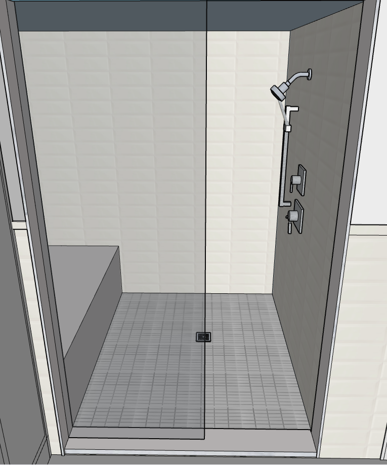 walk in shower will white subway tile on walls with white quartz bench and white quartz shower curb the shower pan is a white 1x2 mosaic