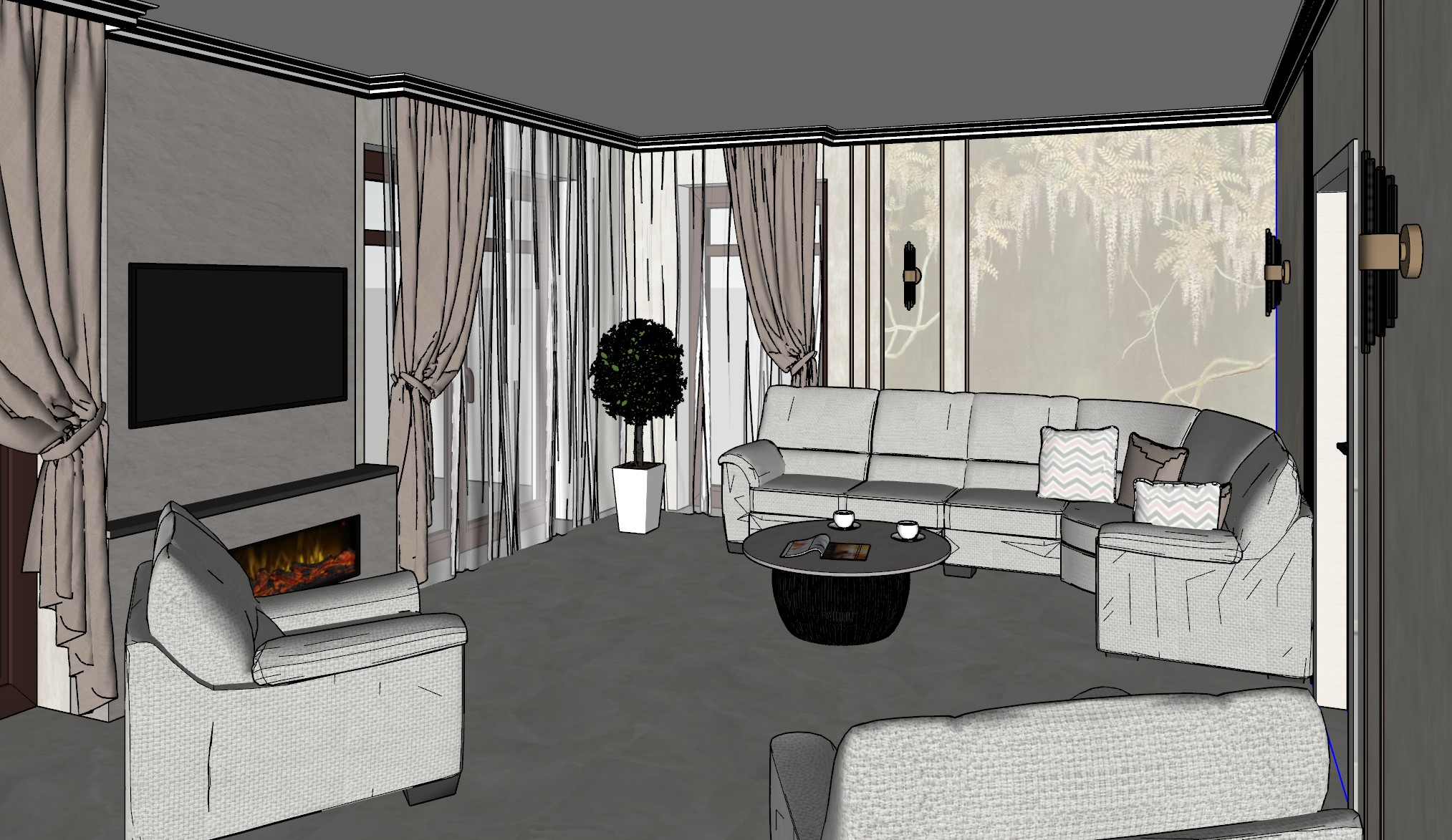 create a photorealistic rendering of this screenshot from sketchup the style is modern classic this is a living room there s a view of the landscape outside the window the left wall has a bio fireplace and a tv the corner sofa and armchair are made of gray beige fabric the floor is glossy marble effect porcelain tile with warm subtle veining the ceiling is white with a cornice around the perimeter add a chandelier in the center of the ceiling that matches the style there s a fresco on the wall behind the sofa the metal profiles are in an aged gold color with mirrored inserts between the outer ones sconces are on the walls the metal color is the same as the profiles on the walls everything is in warm tones elegant classic style soft light pleasant interior
