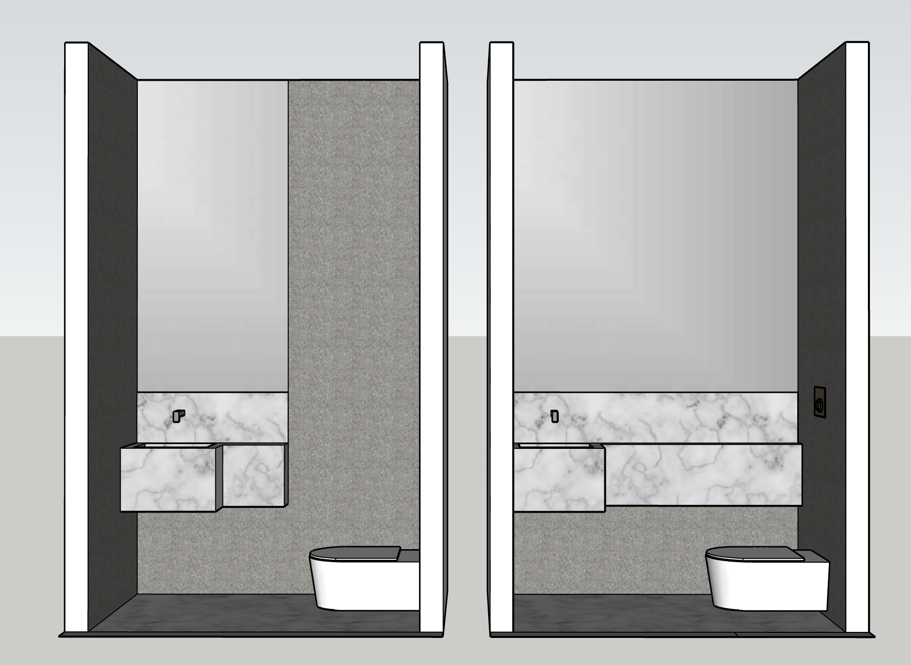 create photo realistic rendering marble sink mirror above textured grey walls