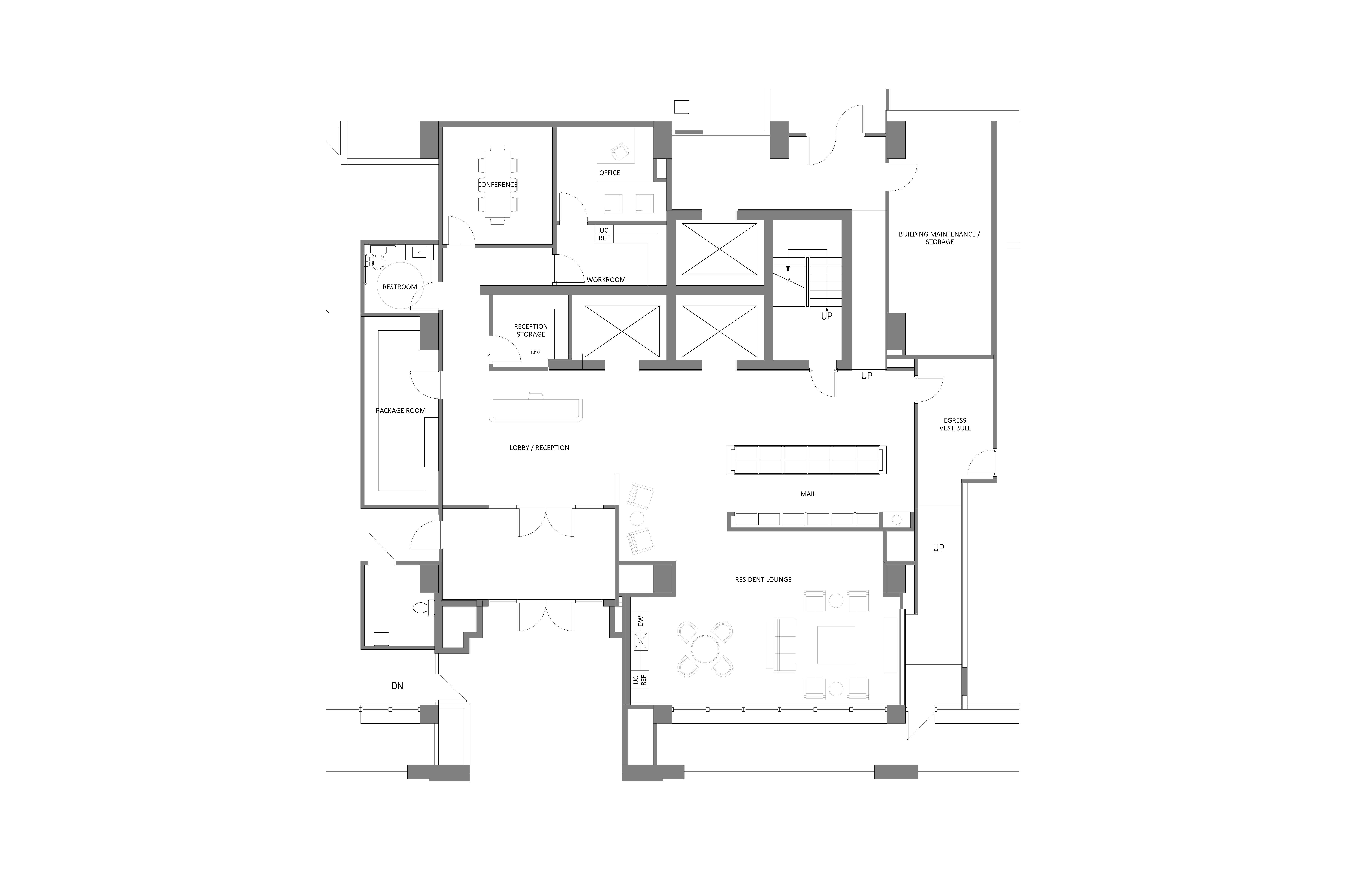 convert this floor plan into a realistic isometric 3d view of a office show the space from an elevated angle with furniture walls and details visible this is the lobby entry reception for a large apartment building the building is in the international style use the same furniture as shows on the plan do not change the orientation of the floorplan