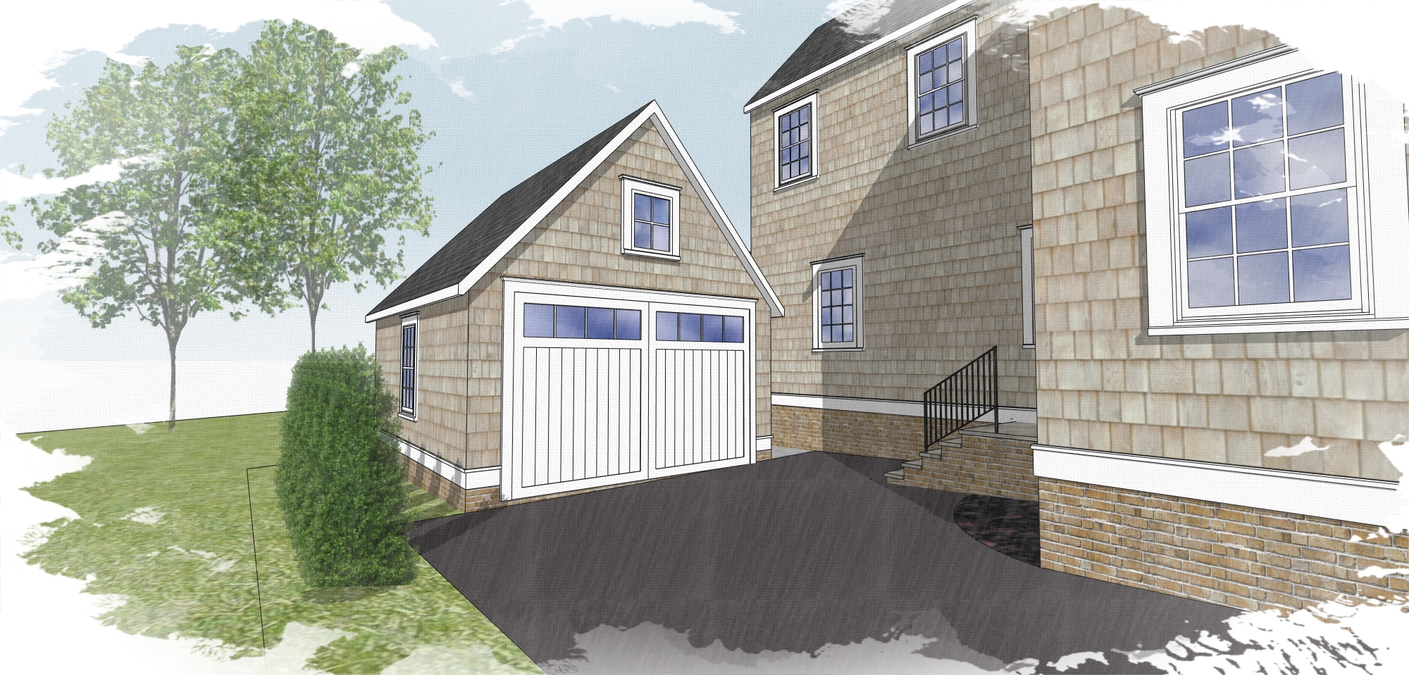 light brown shingle siding with full bright landscaping and trees in background