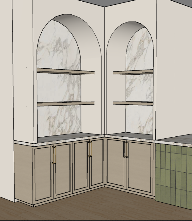 render the image photo realistically keep marble cohesive and make the cabinetry a light oak to match the shelving