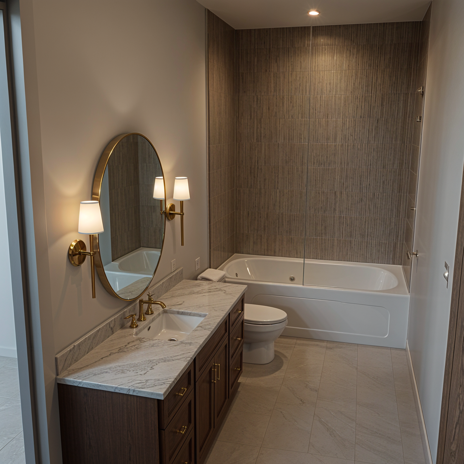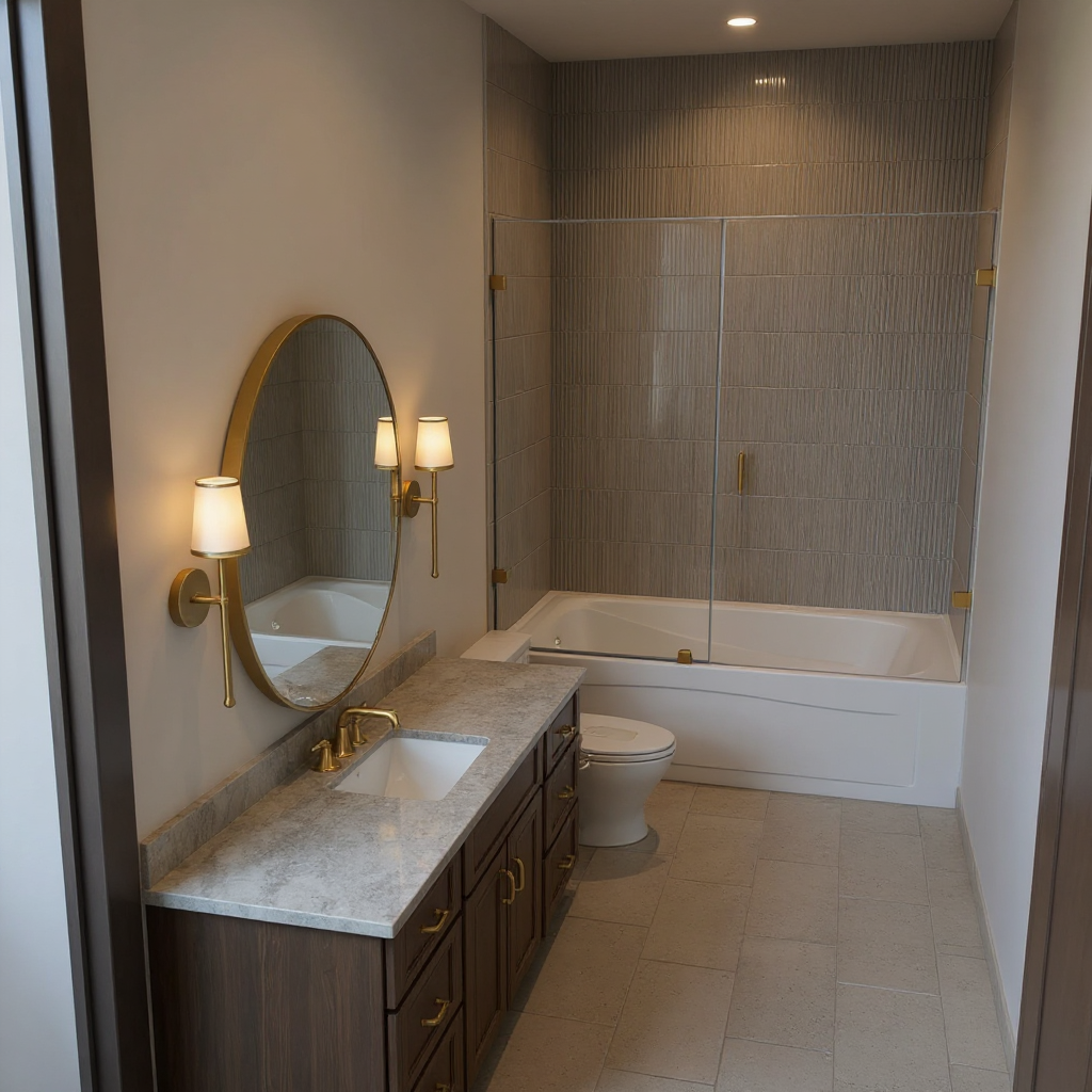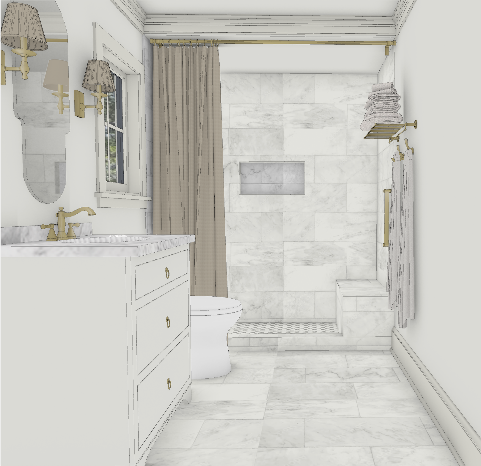 render this bathroom photo realistically the lighting should be light and bright cabinets door and all moldings should be white