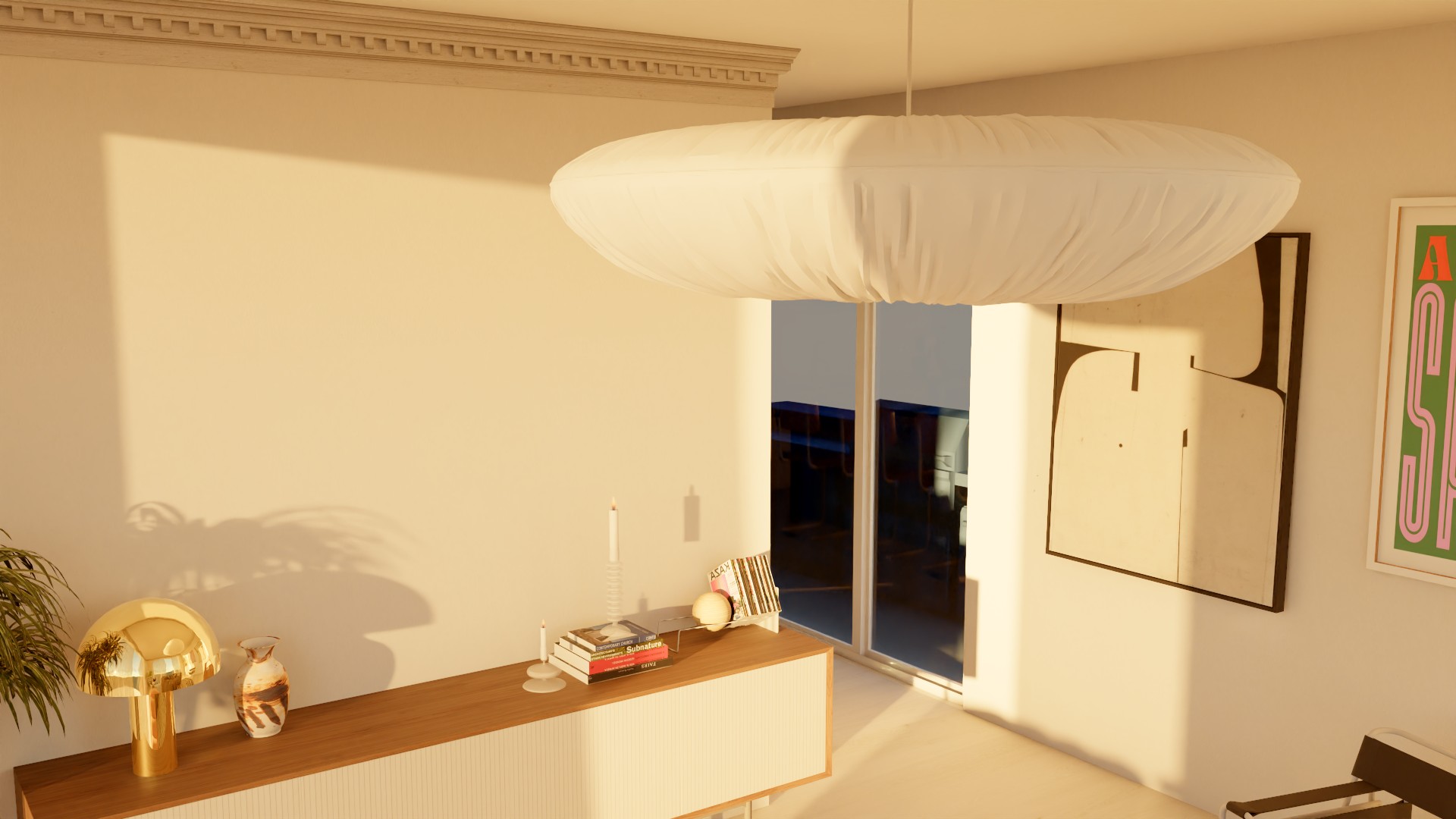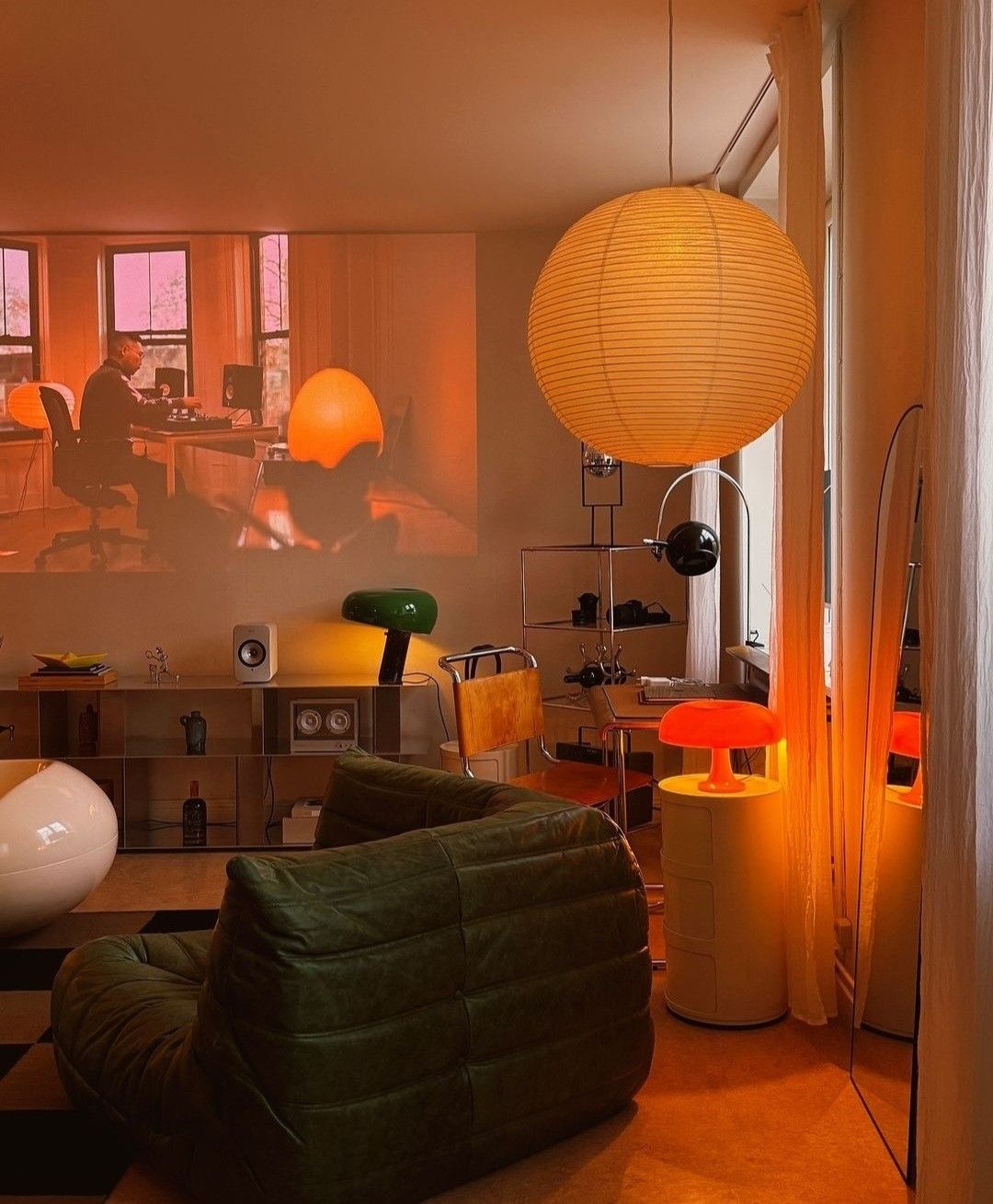interior shot photorealistic interior scene based strictly on the provided image preserve all furniture artwork lighting fixtures console wall surfaces proportions and camera angle exactly as shown do not redesign or stylize any elements lighting primary focus fill the space with soft orange lighting creating a cozy evening atmosphere all light fixtures should be vibrant and orange illumination and subtle color blending across walls and ceiling avoid harsh contrast bloom or over saturation projected movie add a realistic projected movie image above the console on the wall projection should appear soft and slightly imperfect with mild keystone distortion subtle grain and gentle light spill around the edges blacks are not pure black whites are muted as in a real projector the projection should interact naturally with wall texture and existing artwork spacing environment realism ceiling fixture dimly lit slight noise and depth in darker areas no digital sharpness or graphic edges camera realism natural exposure balanced white point shifted warm minimal depth of field feels like a real nighttime interior photograph final output should feel intimate cinematic but real like a lived in room during a movie night not cgi not stylized not over processed