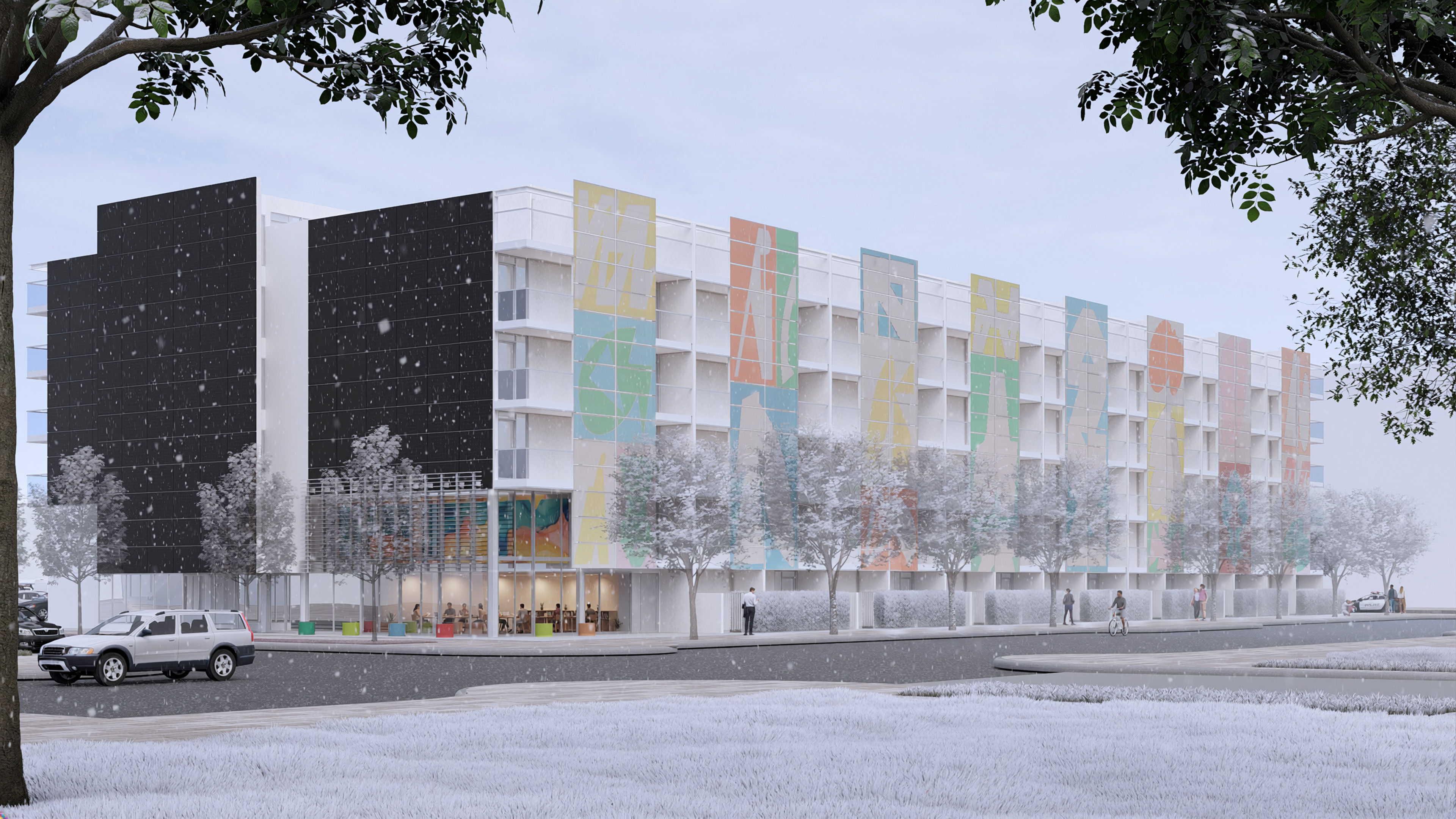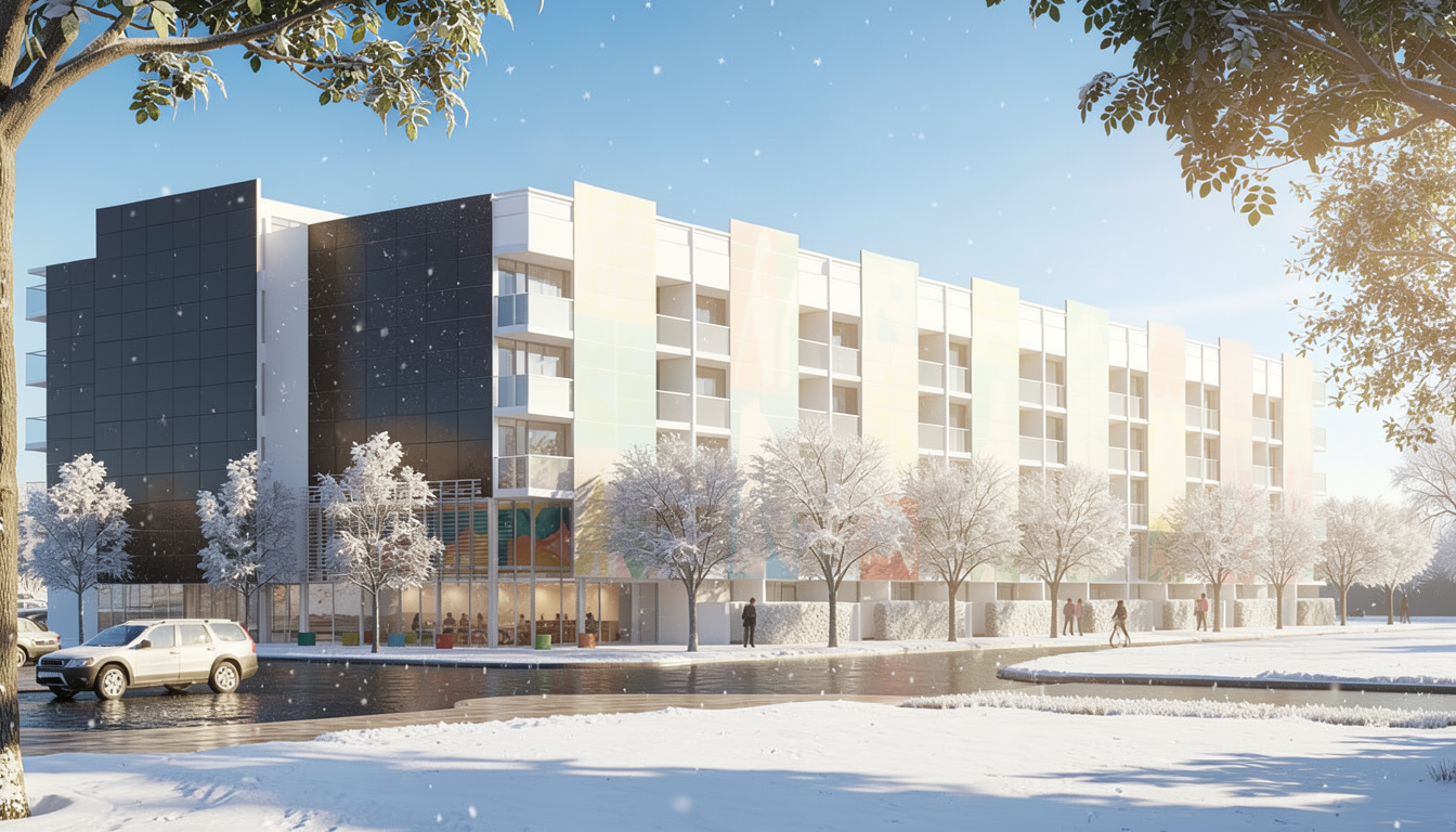 sunny winter day with blue sky and a bit of snow high sun from the top left a couple pedestrians