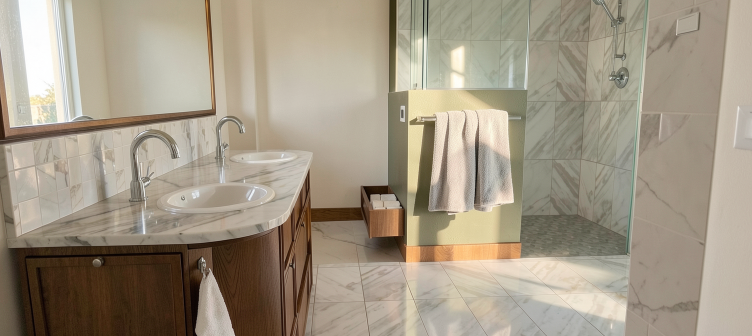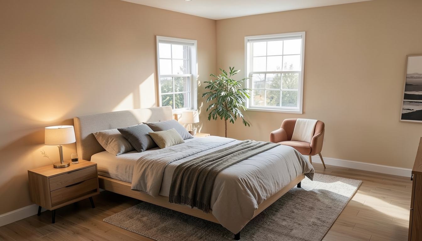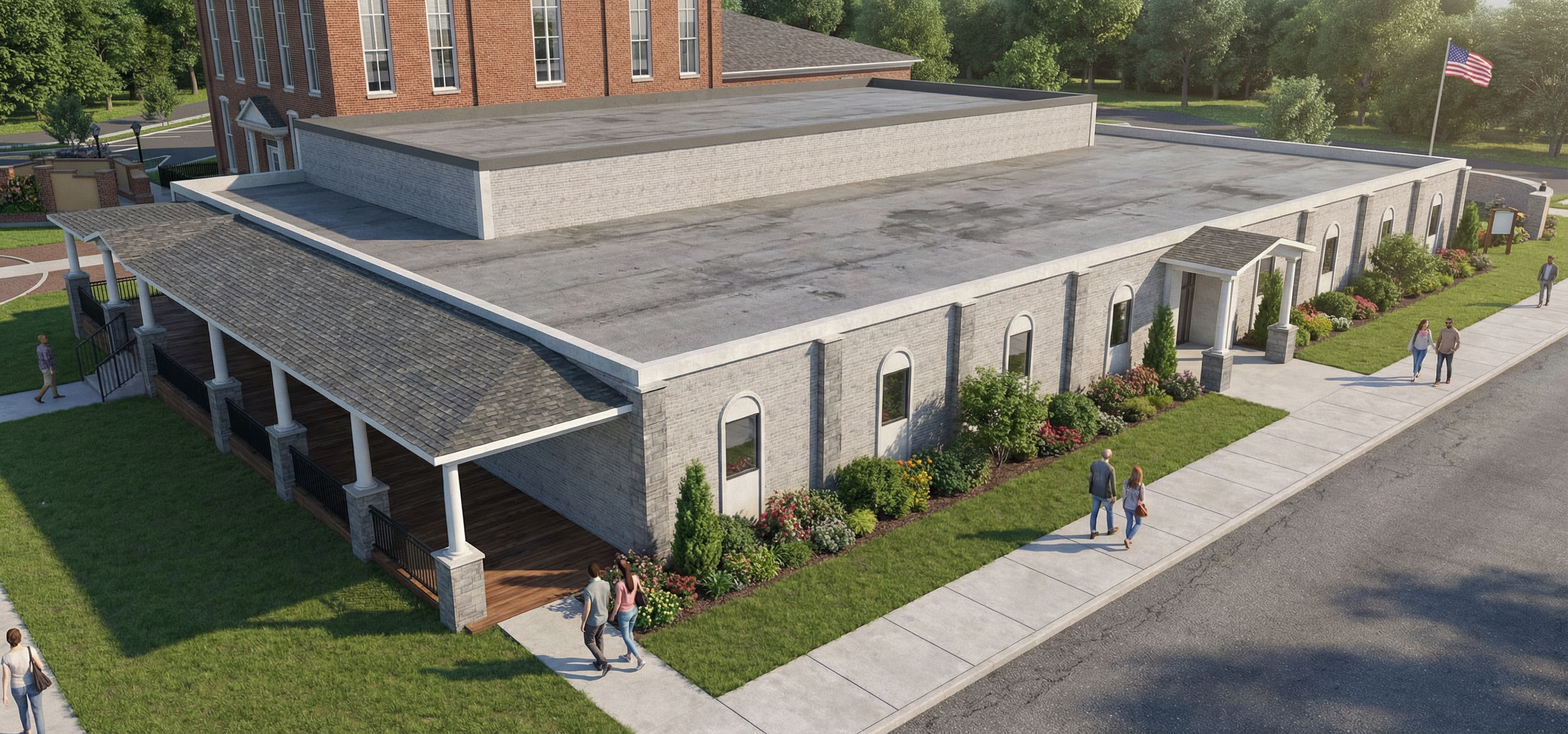 we are standing in the backyard of a home that is set in a residential neighborhood with mature evergreen trees the exterior materials on the continuous two story walls is over grouted white washed stone the area between the two story walls is a white stucco with white window frames and white trim the roof is a black architectural shingle roof it s winter and there is a foot of snow on the ground the time of day is sunset and there are clouds in the sky