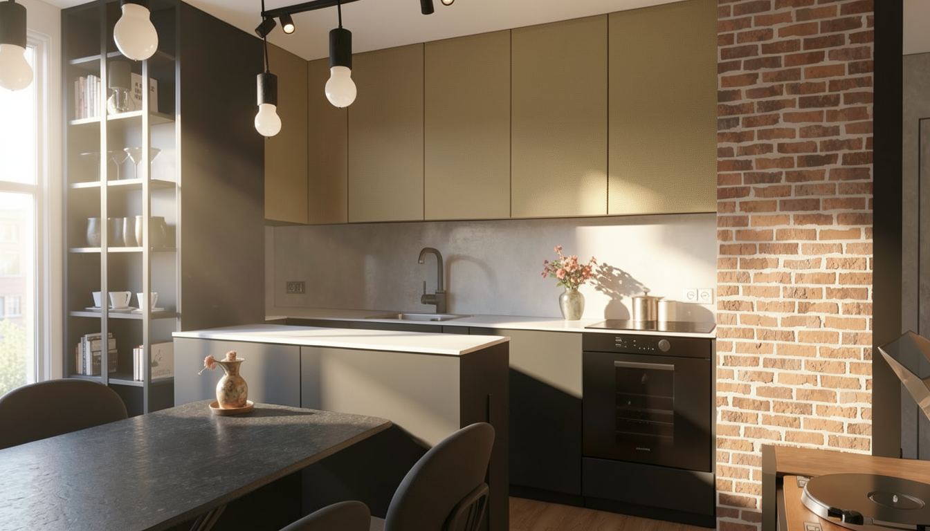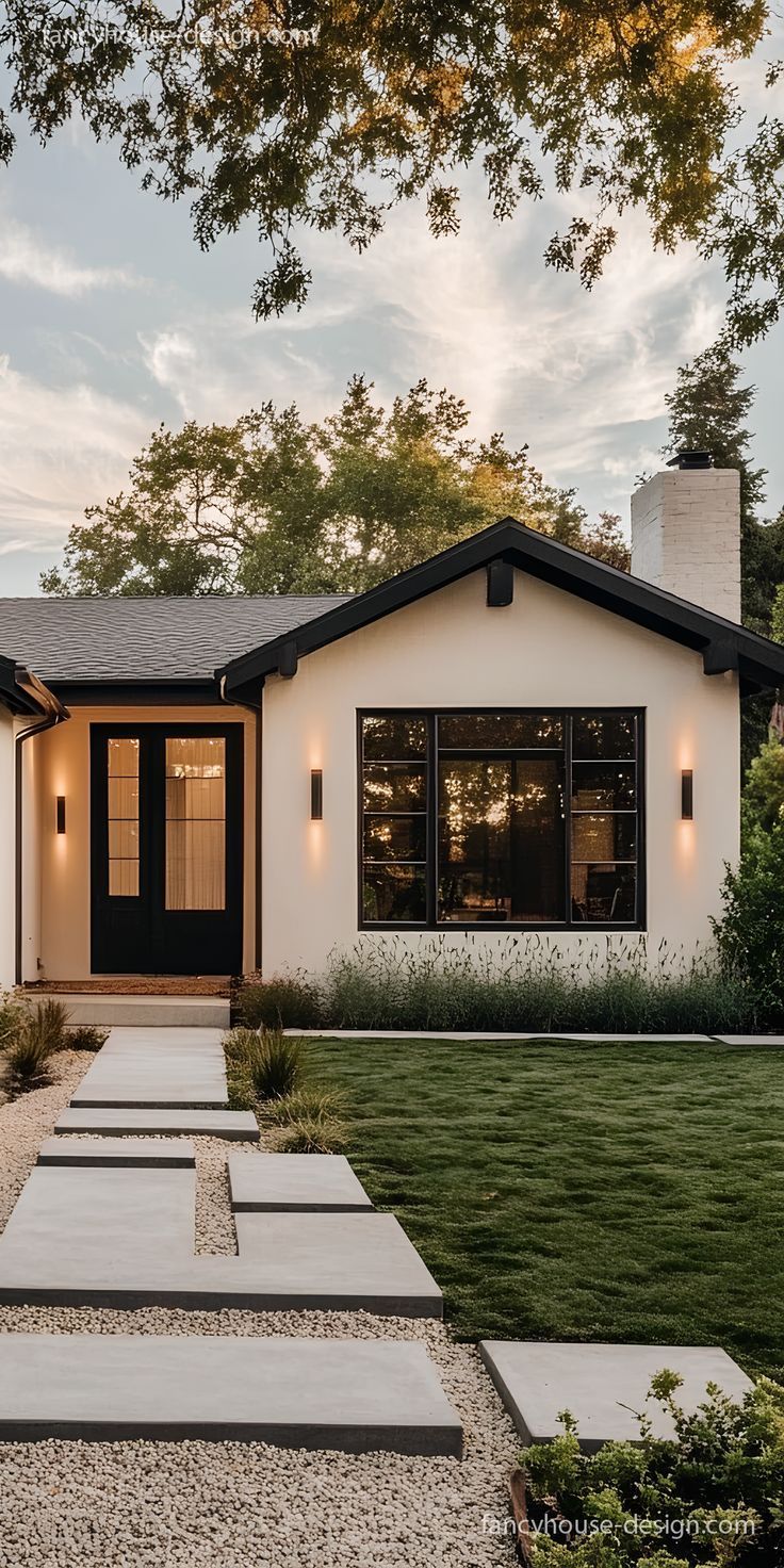 exterior shot add one medium size olive tree to the left behind the fence make fence black metal add concrete paver walkway with pea gravel next to the driveway add flower bushes behind the fence clean up the grass to look nice and maintained add a combination of boulders and small green bushes in front of the house remove boulders adjacent to the driveway update tree at the rear to realistic tree do not move windows doors match the color scheme only from the reference image and the landscape