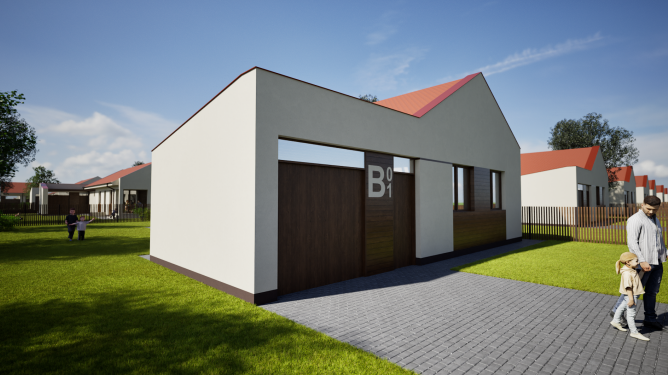 task image to image architectural render goal hyper realistic exterior real estate photo with clean empty scene reference image use as base true preserve composition true preserve building shape true preserve facade layout true preserve window positions true preserve roof geometry true preserve driveway alignment true preserve garden layout true strength 64 prompt transform the uploaded image into an extremely photorealistic exterior real estate photograph that looks indistinguishable from a real world property marketing photo preserve the exact camera angle composition building shape facade layout window positions roof geometry driveway alignment lawn areas and overall scene structure keep the modern single story detached house but make all materials look completely real and naturally imperfect subtly textured off white plaster facade authentic dark wood cladding with realistic grain and tonal variation terracotta red pitched roof with believable natural irregularity realistic paving stones with subtle texture variation tidy but natural green lawn realistic fencing and believable glazing reflections remove all people completely from the image including all adults and children in the foreground and background remove all visible letters numbers facade labels and unnecessary text markings including the b01 sign keep the scene clean and empty the final image must look like a premium professional dslr property photo not cgi or an architectural render use natural late morning sunlight soft physically accurate shadows realistic dynamic range subtle lens realism natural micro contrast true to life colors crisp detail slight atmospheric depth and premium but realistic real estate photo editing include subtle natural imperfections and realistic material variation do not redesign the architecture do not alter the composition style type hyper realistic photography visual quality maximum detail level ultra high material realism indistinguishable from real life color grading neutral premium real estate photography camera view front side exterior property photo lens 38mm framing house dominant driveway visible open lawn around the building depth of field mostly sharp with natural optical falloff camera character professional full frame dslr natural optics realistic sensor response lighting time of day late morning sky natural blue sky with soft real clouds light quality clean natural sunlight shadows soft and physically accurate with realistic falloff exposure balanced real camera exposure with preserved highlight and shadow detail environment season summer vegetation healthy but realistic lawn tidy suburban greenery setting quiet suburban residential development mood premium calm clean believable natural people and objects remove people true remove children true remove large graphic labels true remove unnecessary text markings true keep scene clean and orderly true negative prompt people pedestrians human figures adults children crowd cgi render look architectural visualization artificial image cartoon illustration stylized low poly plastic materials overly perfect surfaces fake grass exaggerated sharpness overprocessed hdr oversaturated colors distorted perspective warped roof deformed windows floating objects blurry image fog rain night text overlays giant letters labels artifacts low resolution fisheye distortion output aspect ratio 16 9 render intent premium real estate exterior marketing photo generation preferences composition preservation very high architecture preservation very high photorealism priority maximum cgi stylization none material accuracy maximum visual consistency very high natural imperfections enabled
