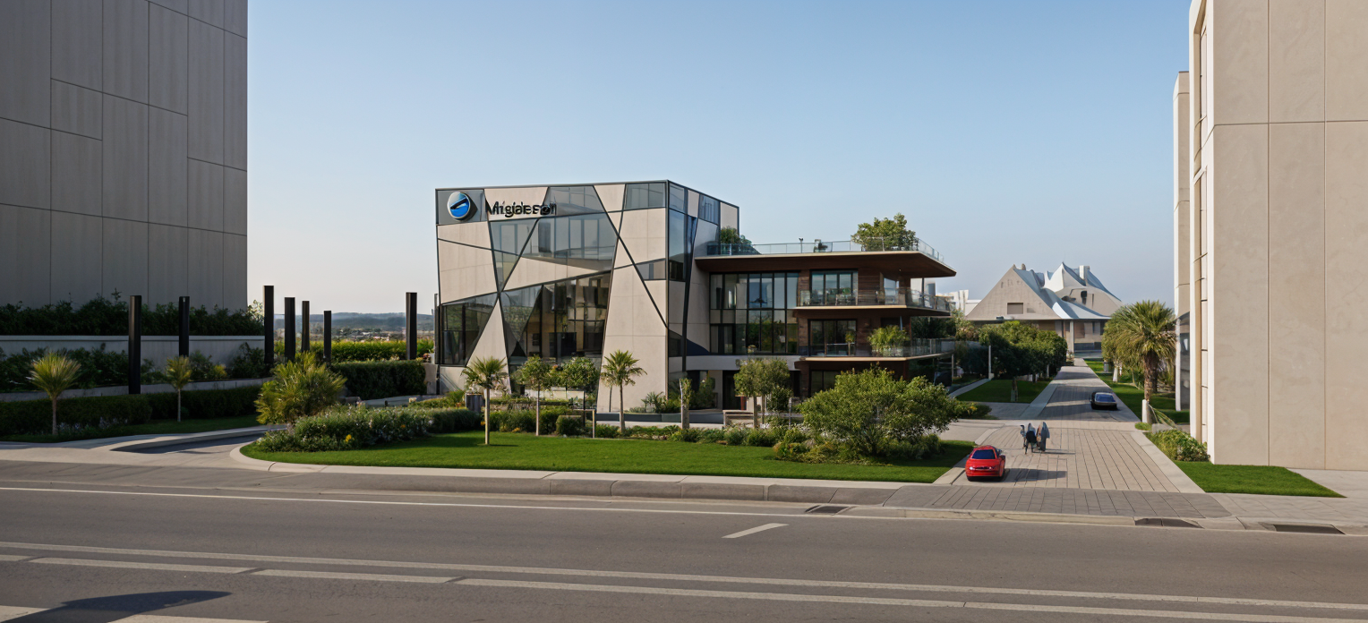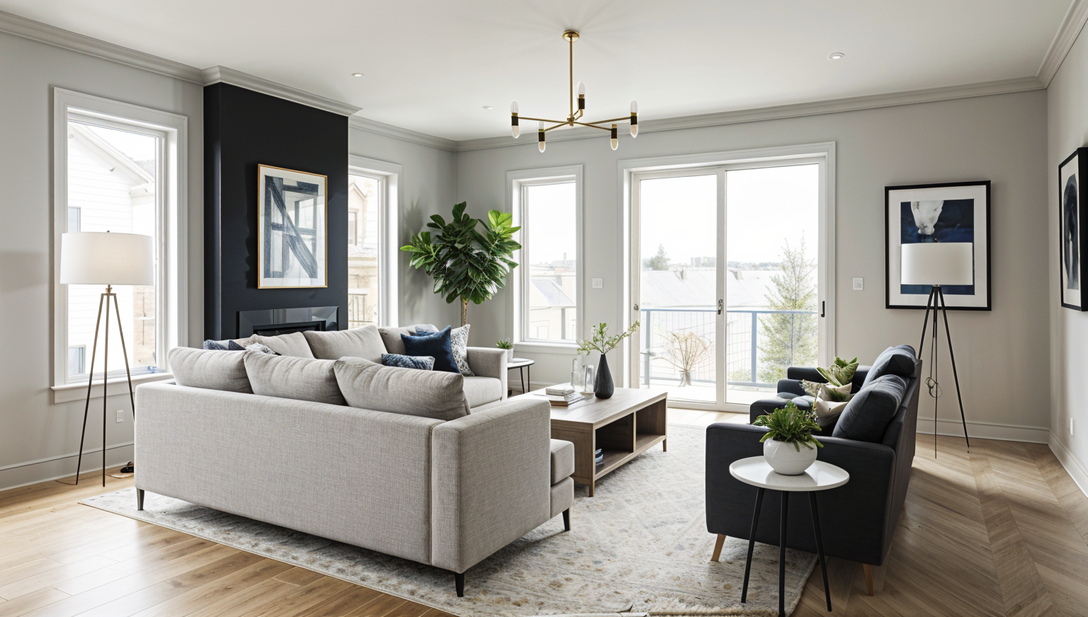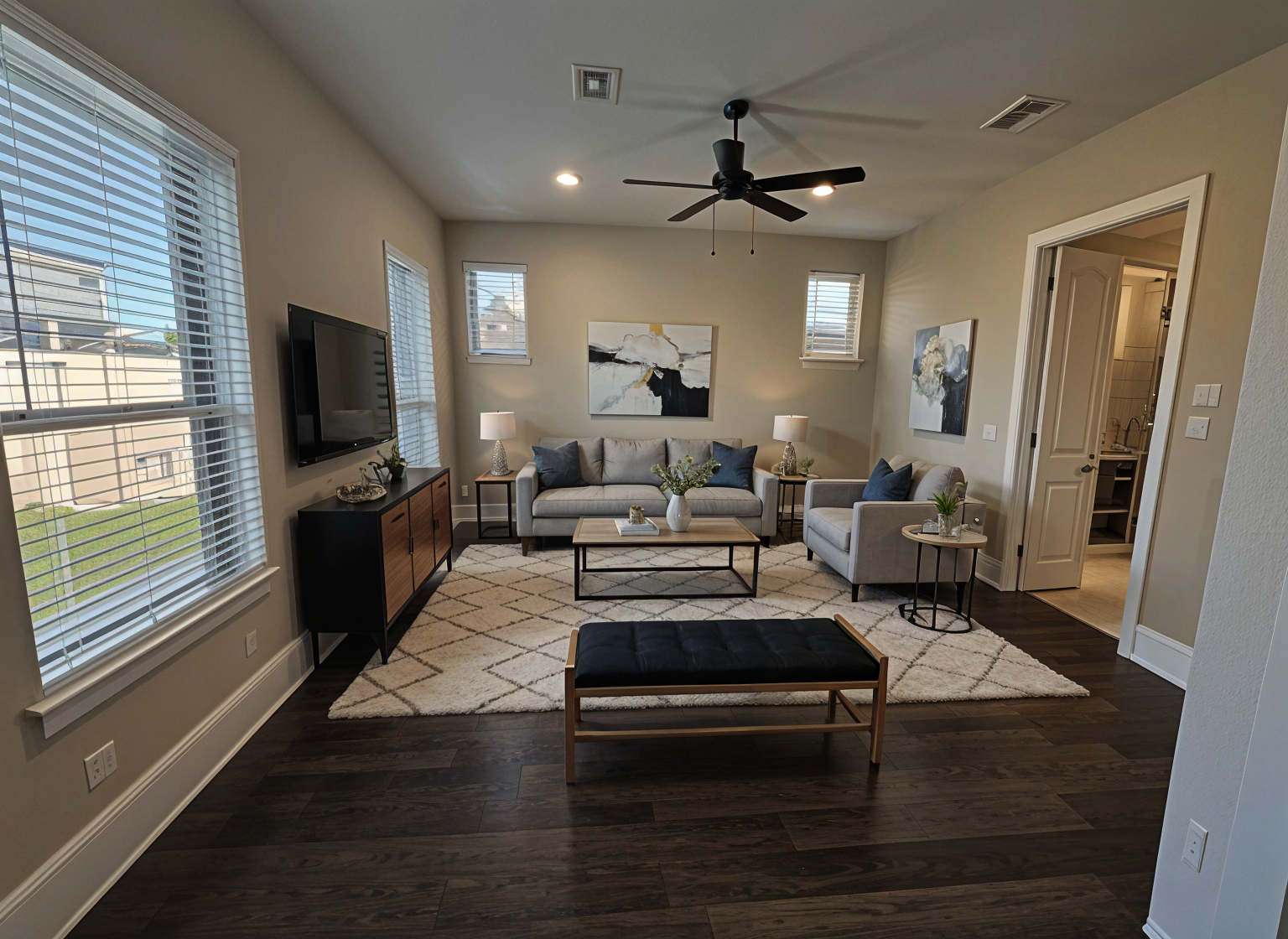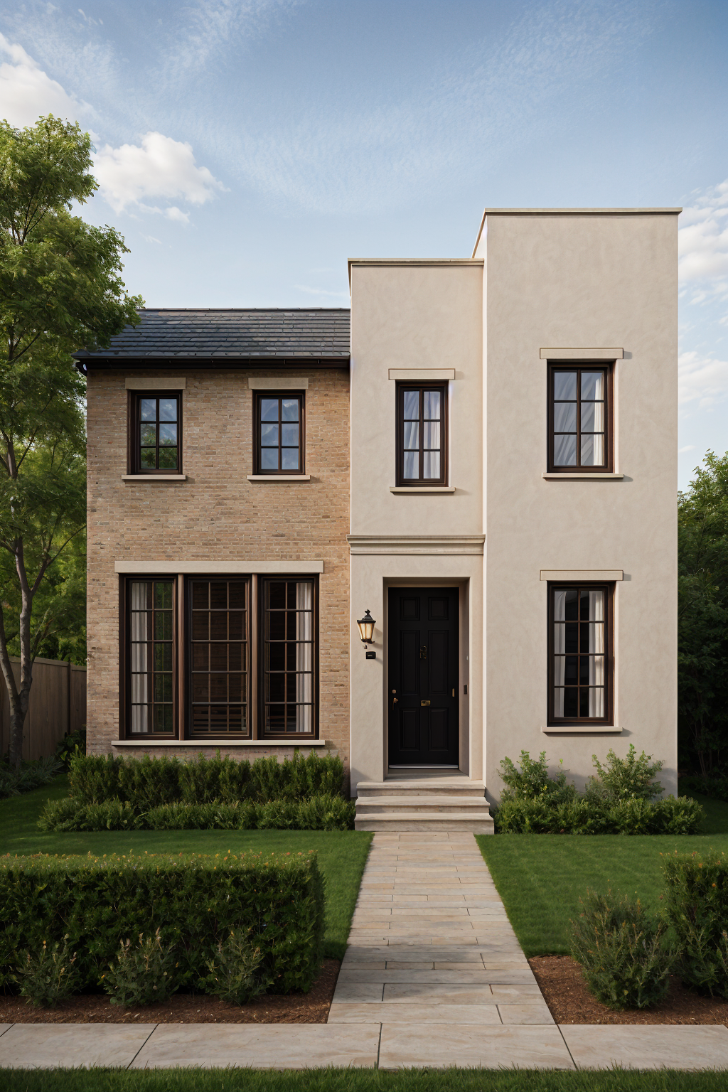 render a beautifully detailed two story house with a rustic stone exterior use a warm earthy palette for the stones incorporating shades of dark grey light grey and subtle grays for depth the roof should be a weathered slate dark gray with gentle variations in tone large windows with black frames add a modern touch lush greenery surrounds the house use deep greens for the trees and bushes adding hints of sunlight with soft yellows the pathway leading to the house is subtle gray flanked by trimmed grass create a serene sunny afternoon atmosphere with a clear blue sky architecture