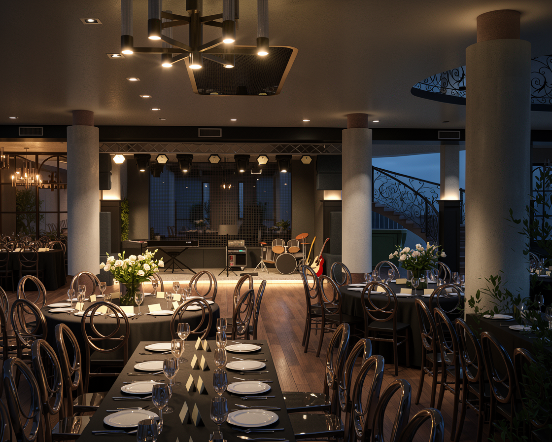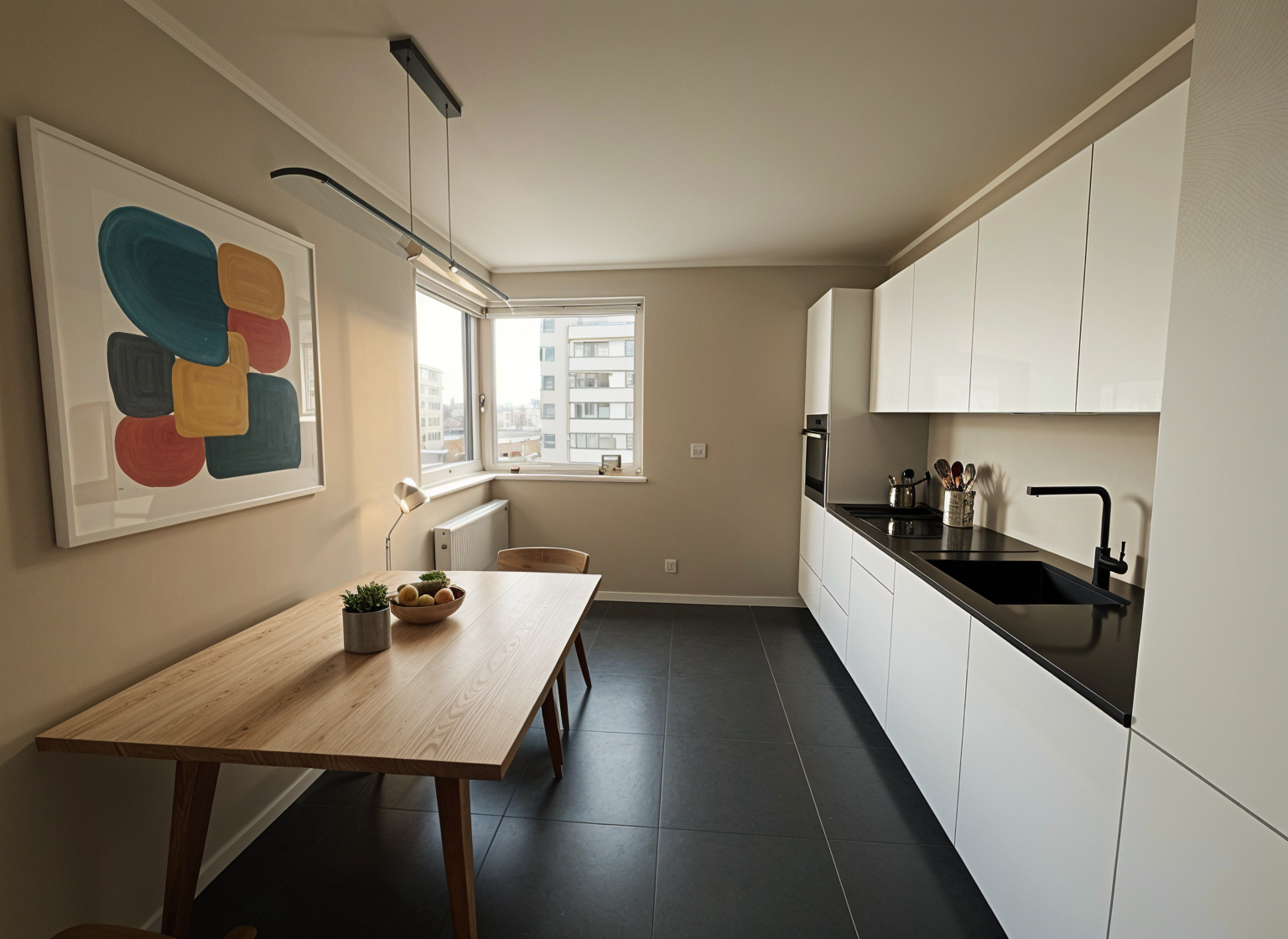 new urbanism interior shot modern kitchen beige walls white ceiling add kitchen accessoires floor with dark tiles carpet under the table 4 chairs at the table modern elegant ceiling lamp modern picture with color on the wall keep room proportion and windows like it is architecture