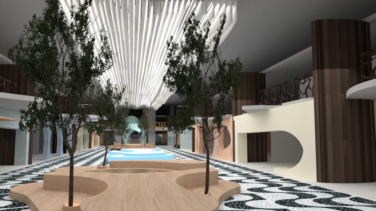 a stunning architectural interior featuring a modern shopping mall emphasize a grand ceiling with cascading white lights for an elegant contemporary look include lush verdant green trees along the walkway design a sleek central pathway with intricate black and white geometric patterns on the floor wooden benches in natural oak provide warmth complementing beige and soft pastel walls for a welcoming feel set the ambiance with soft lighting creating an inviting and luxurious atmosphere add store name