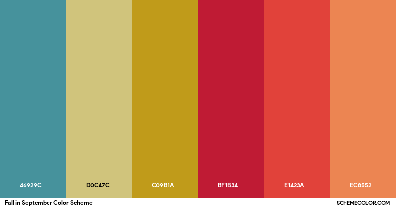 create a serene autumn landscape capturing the essence of fall in september the sky is a deep teal blue 46929c blending smoothly into a muted golden c09b1a horizon as the sun sets the trees are vibrant adorned with leaves transitioning from soft beige d0c47c to striking scarlet red bf1b34 with a hint of orange warmth e1423a the forest floor is carpeted with fallen leaves in an earthy orange hue ec8552 the atmosphere is calm and crisp evoking the tranquil beauty of early autumn days