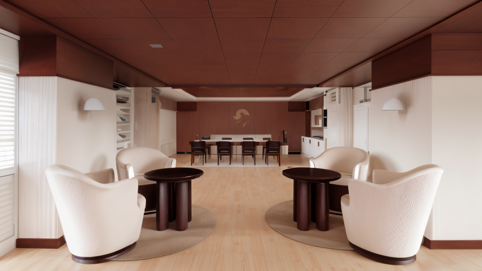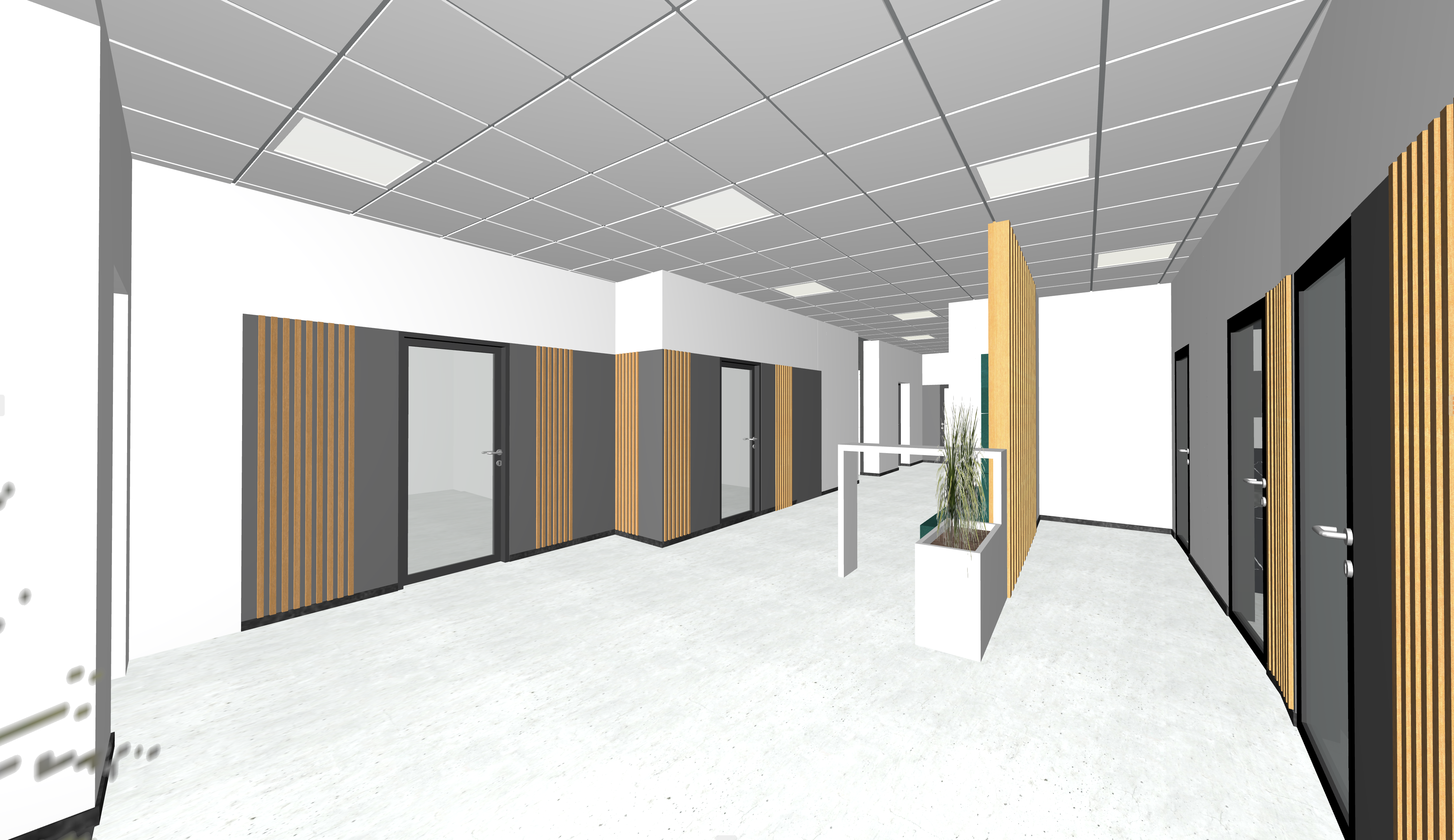 bright interior of the office corridor pvc flooring and concrete white and silver walls with wooden strips