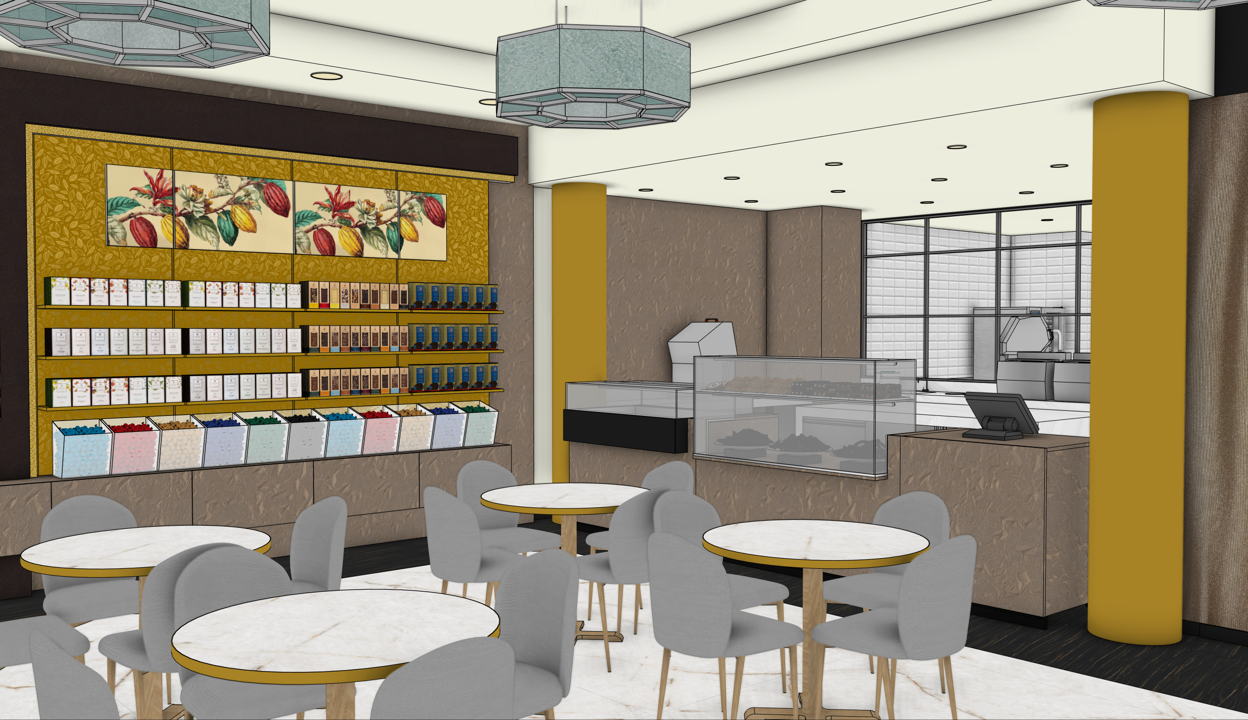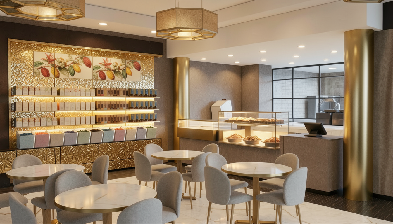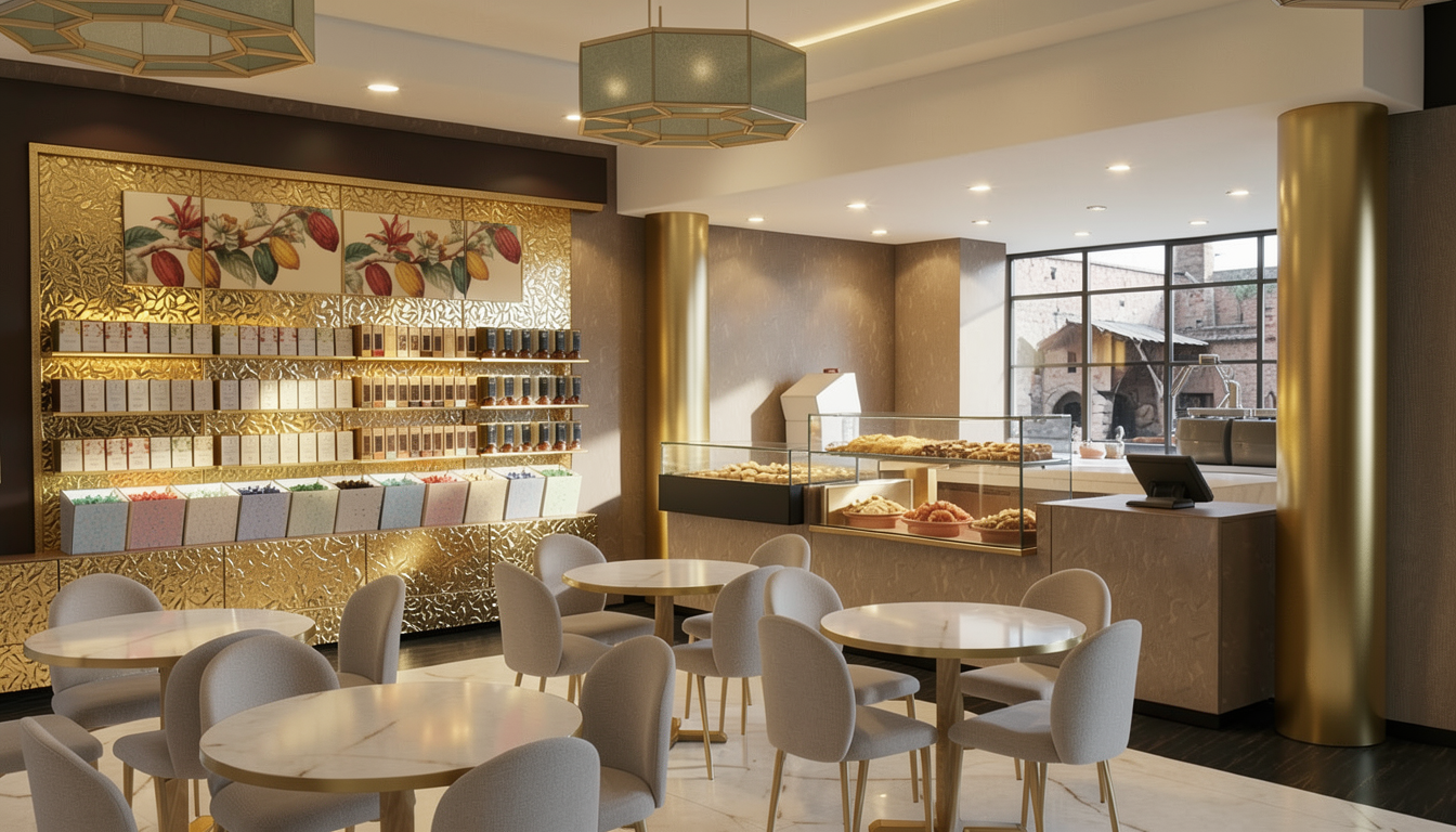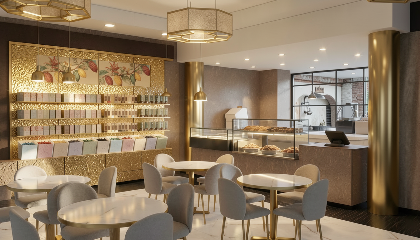 convierte la imagen en foto realista manteniendo las formas colores y texturas el mueble dorado de la izquierda es una chapa dorada una trama troquelada por la que sale luz lo de la derecha no es una ventana exterior es una ventana que da al obrador de churrer a las vitrinas tienen luz las l mparas que cuelgan del techo iluminan las columnas son doradas con poco brillo las mesas tienen perfil y patas doradas es una imagen interior no entra luz de fuera mant n la textura de la parte baja del mueble como la original
