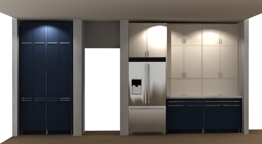 white countertop between the blue base cabinets and the white wall cabinets all cabinets are 1 1 2 skinny shaker blue cabinets are sherwin williams naval white wall cabinets are sherwin williams white flour floor is plank red oak no stain and natural finish
