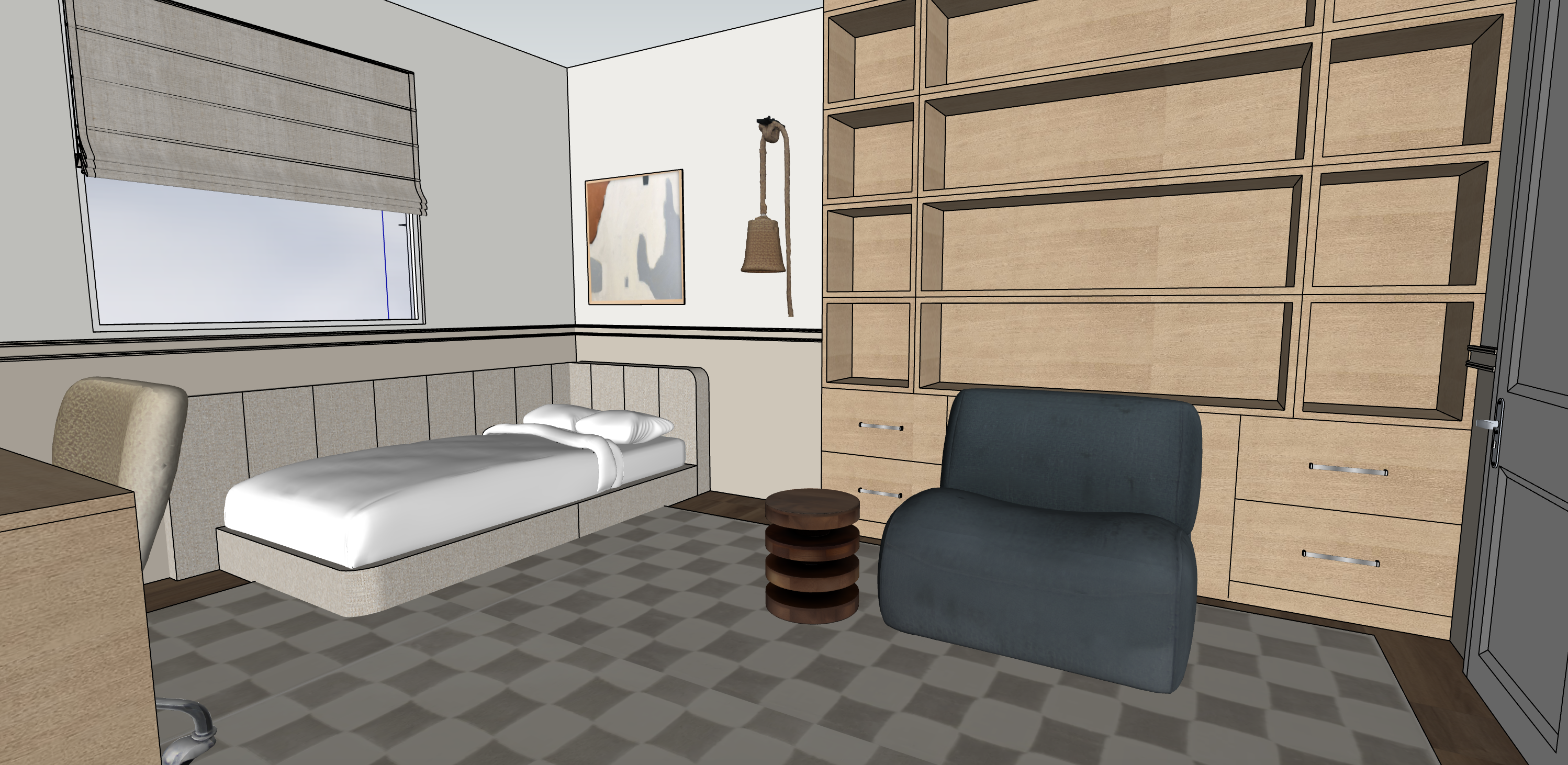 extra large checkered rug in grey and ivory wall are light grey in the bottom and ivory on the top split by a light grey molding