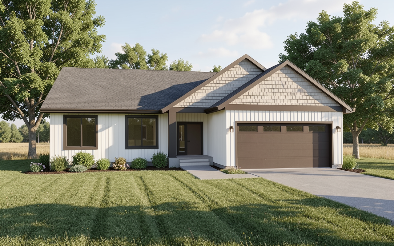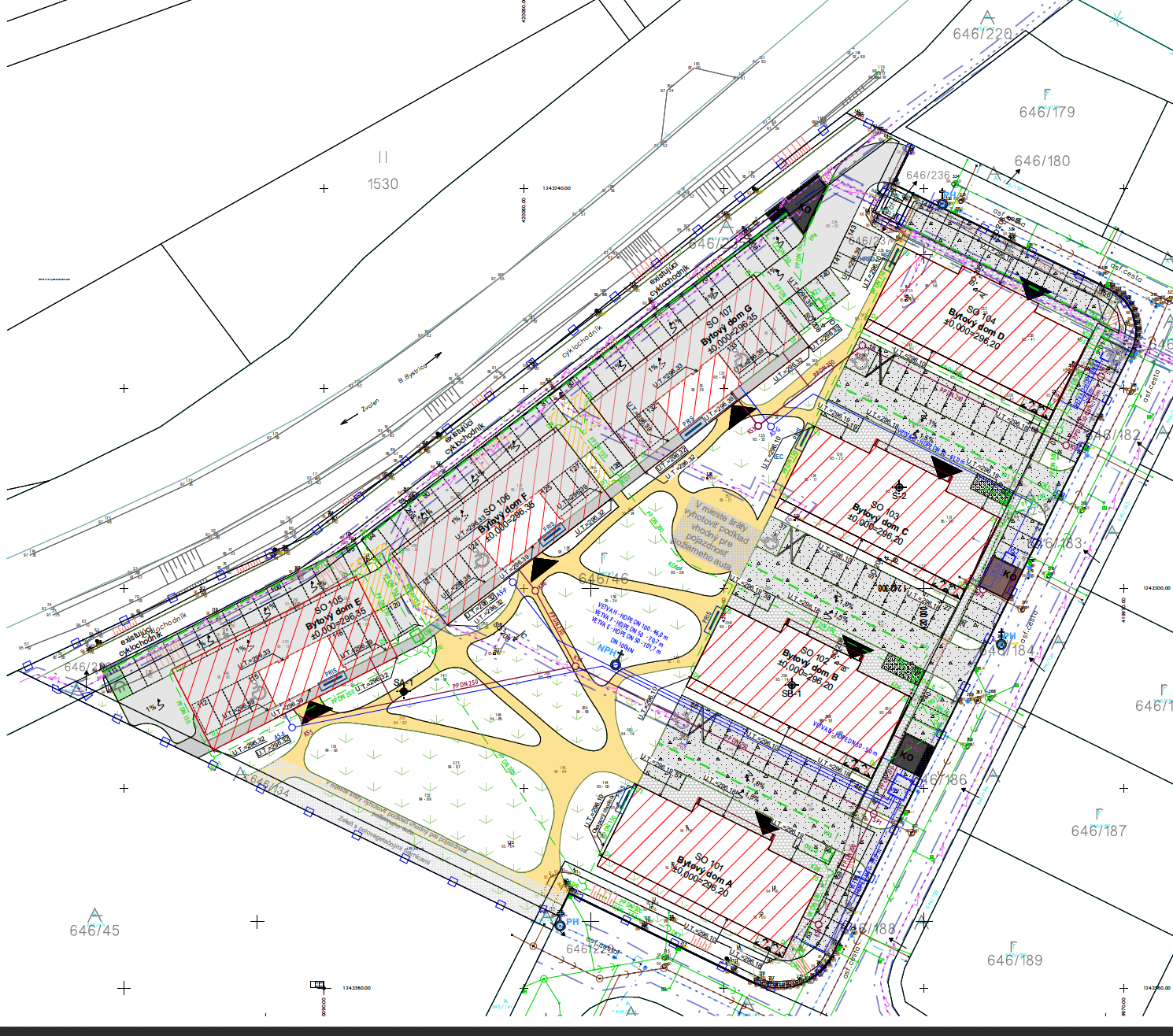 vytvor vizualiz ciu 7 bytov ch domov s modernou bielou fas dou ploch mi strechami kde s byty s terasami balk nov z bradlia s sklenen v etky kovov prvky olemovania a sokle maj antracitov farbu parkovisk s asfaltov vn troblok je pretkan mlatov mi chodn kmi a zelen mi ostrov ekmi s tr vou pokryt mi kop ekmi