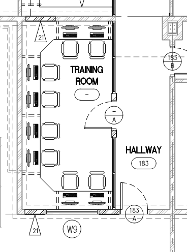 convert this floor plan into a realistic isometric 3d view of a office show the space from an elevated angle with furniture walls and details visible create a realistic rendering of the training room include polished concrete floors full height storefront glass with a glass entry good inside the room should have modern furniture and computers with 8 individuals work stations match our layout and do not change the concept use the same furniture as shows on the plan do not change the orientation of the floorplan