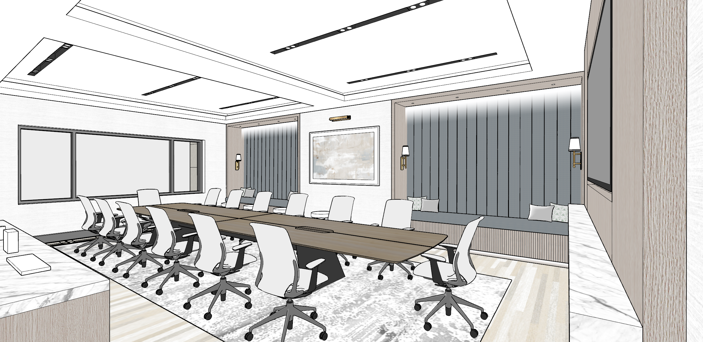 transform the provided image into a highly realistic photorealistic rendering of a luxurious corporate amenity conference space the environment should feel warm welcoming and upscale designed for professionals to meet collaborate and relax emphasize comfort and sophistication and residential hospitality inspired feel incorporate rich light oak wood finishes throughout include tray ceilings and ensure lighting is evenly distributed across all areas using a balanced mix of natural daylight and warm ambient artificial lighting with no harsh shadows or dark corners enhance realism in a daytime setting populate the space with numerous white business professionals engaged in meetings and conversation make the tv on the right side show charts and graphs views through the windows should show a building facade overall mood elegant contemporary warm and highly realistic blending luxury hospitality with modern corporate additional white business people sitting on each banquette add cove lighting to tray ceilings