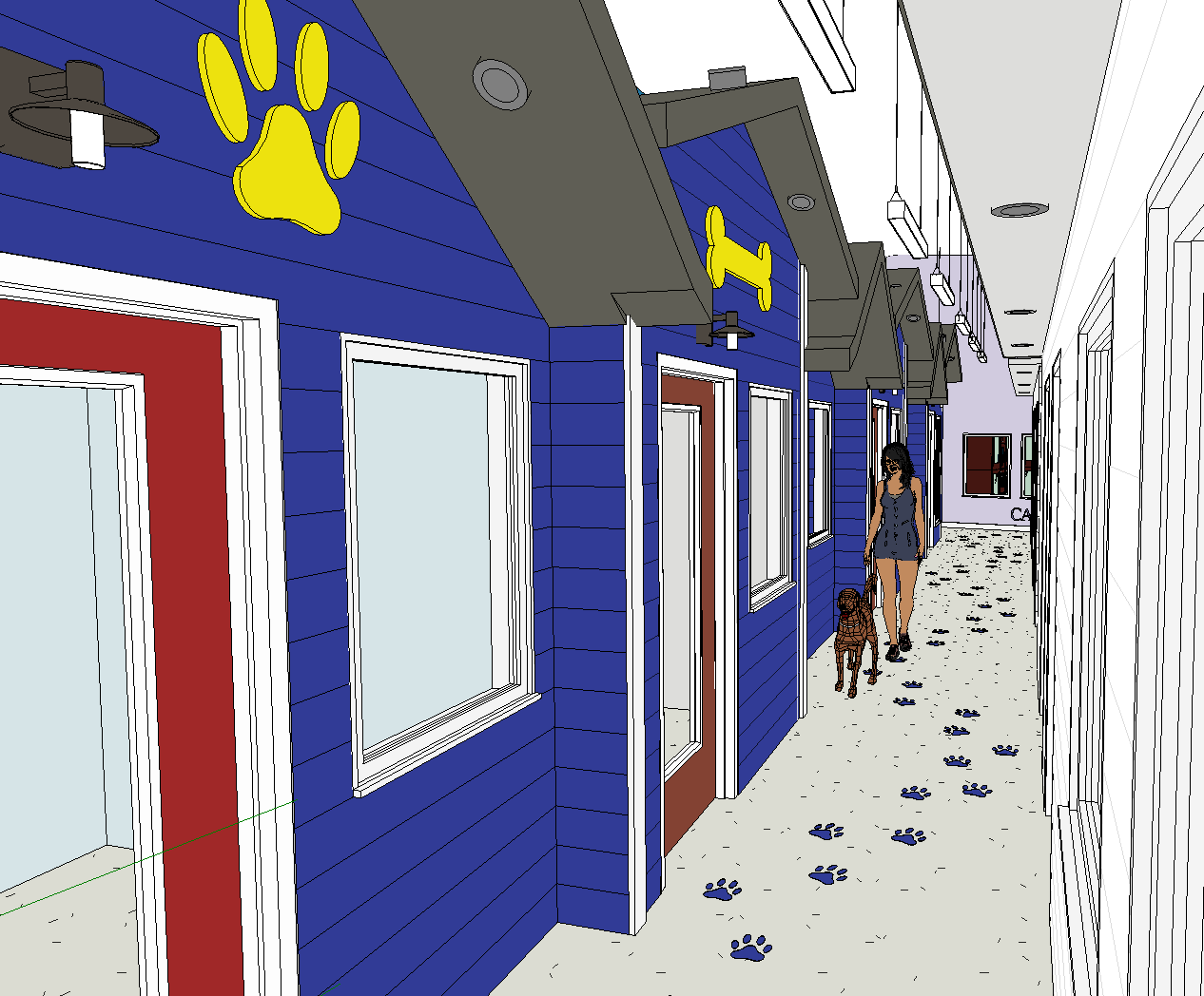 render this make the person in animal shelter attire with a dog add an screen display on each window sill for dog profiles add depth to the yellow bone and dog pay signs white speckled floor with winding dog paw prints make the wall on the right white siding