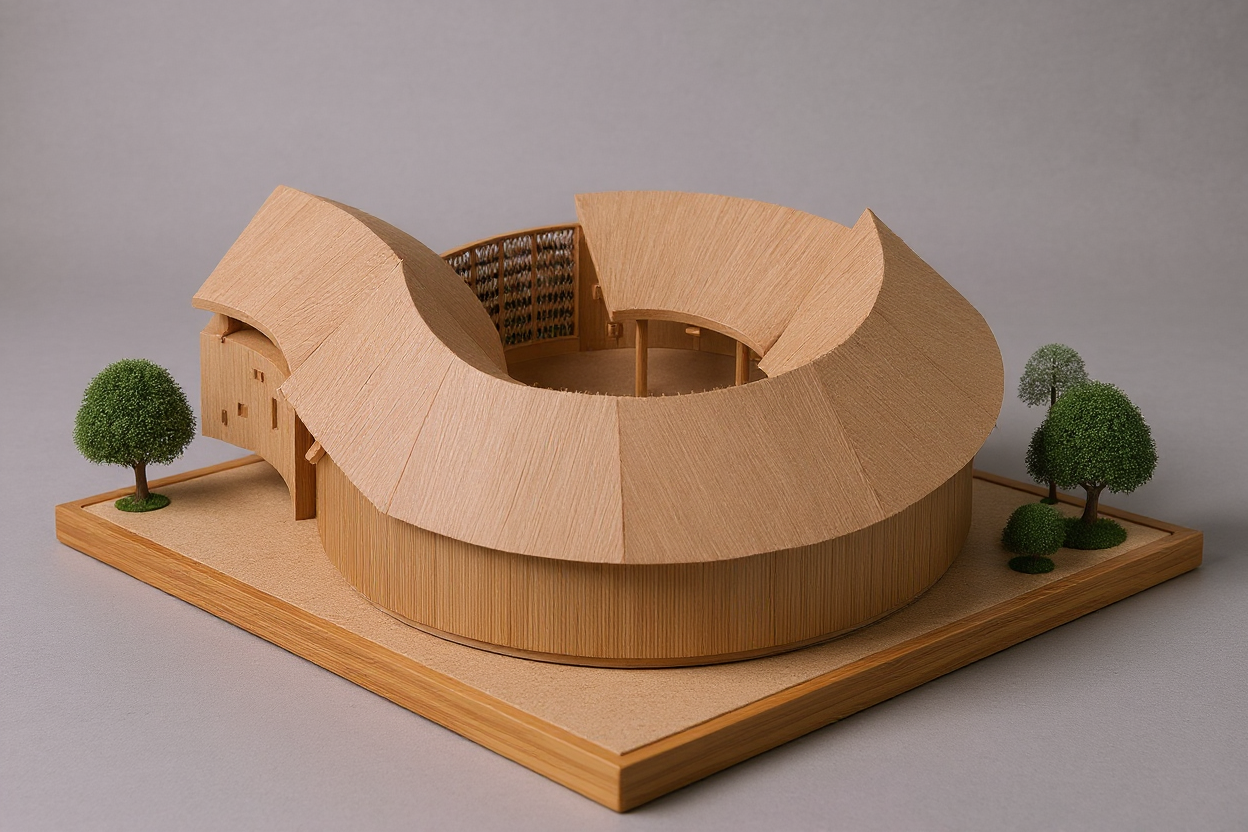 the architectural model is mounted on a base made of the same material and is accompanied by small natural look miniature trees placed on both sides providing scale and context the background is neutral and gray typical of a studio photograph for architectural models the model itself is crafted from materials resembling balsa wood or kraft cardboard base similar shape of the model