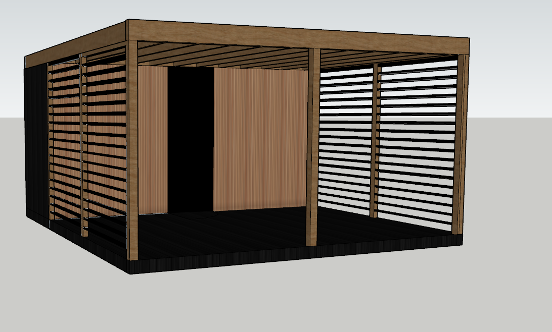 garden pergola with charcoal decking to the floor brown timber with black timber laths to the sides the back wall has similar colour of the painting brown timber post but in a cladding douglas fir colour
