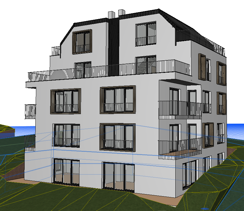 a modern multi story building with a clean minimalist design featuring white walls and sleek black window frames and frames around some of the windows made out of black hammered metal the balconies are designed with elegant thin anthracite steel railings the roof is a contemporary flat style in a deep black the surrounding area is landscaped with lush green lawns trees at the back and subtle garden the atmosphere is serene with a bright clear blue sky and soft sunlight casting gentle shadows creating a harmonious and inviting scene