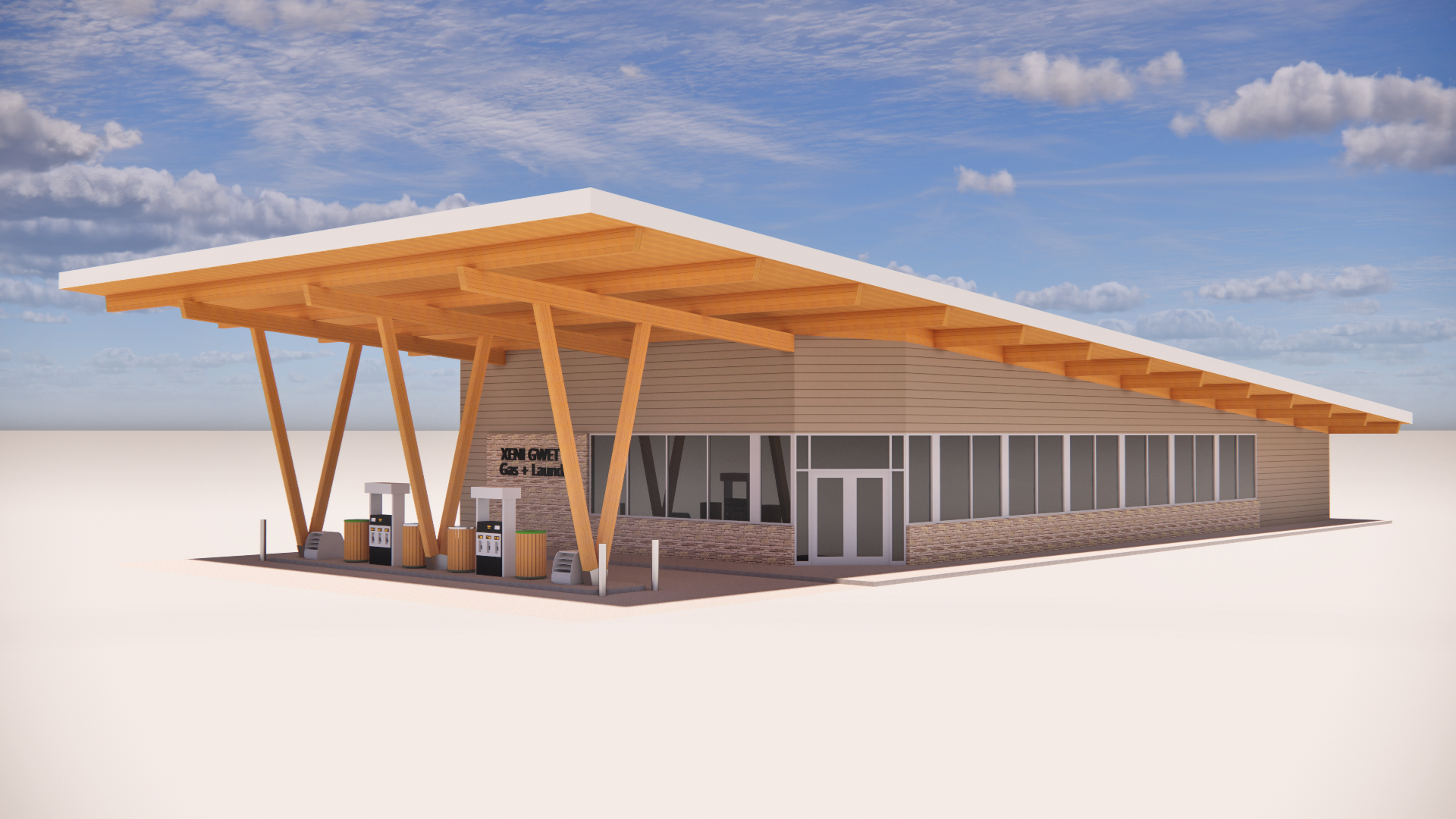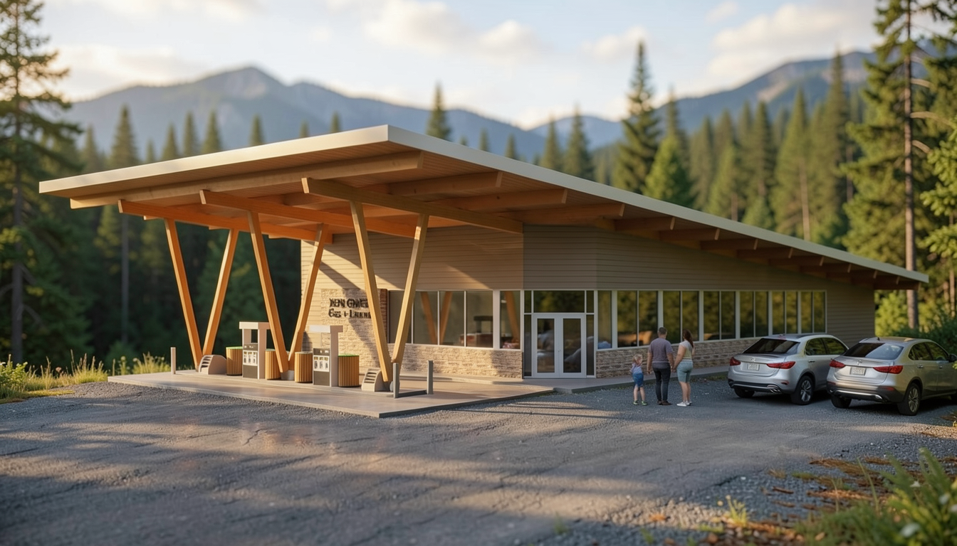 keep the building and design the same can you add the following background of the forest in north bc 2 3 people and a few cars parked on the right hand side of the building pointed or facing the building can you also blur the mountains and trees in the background can you change the sun angle so the building on the right is in sunlight