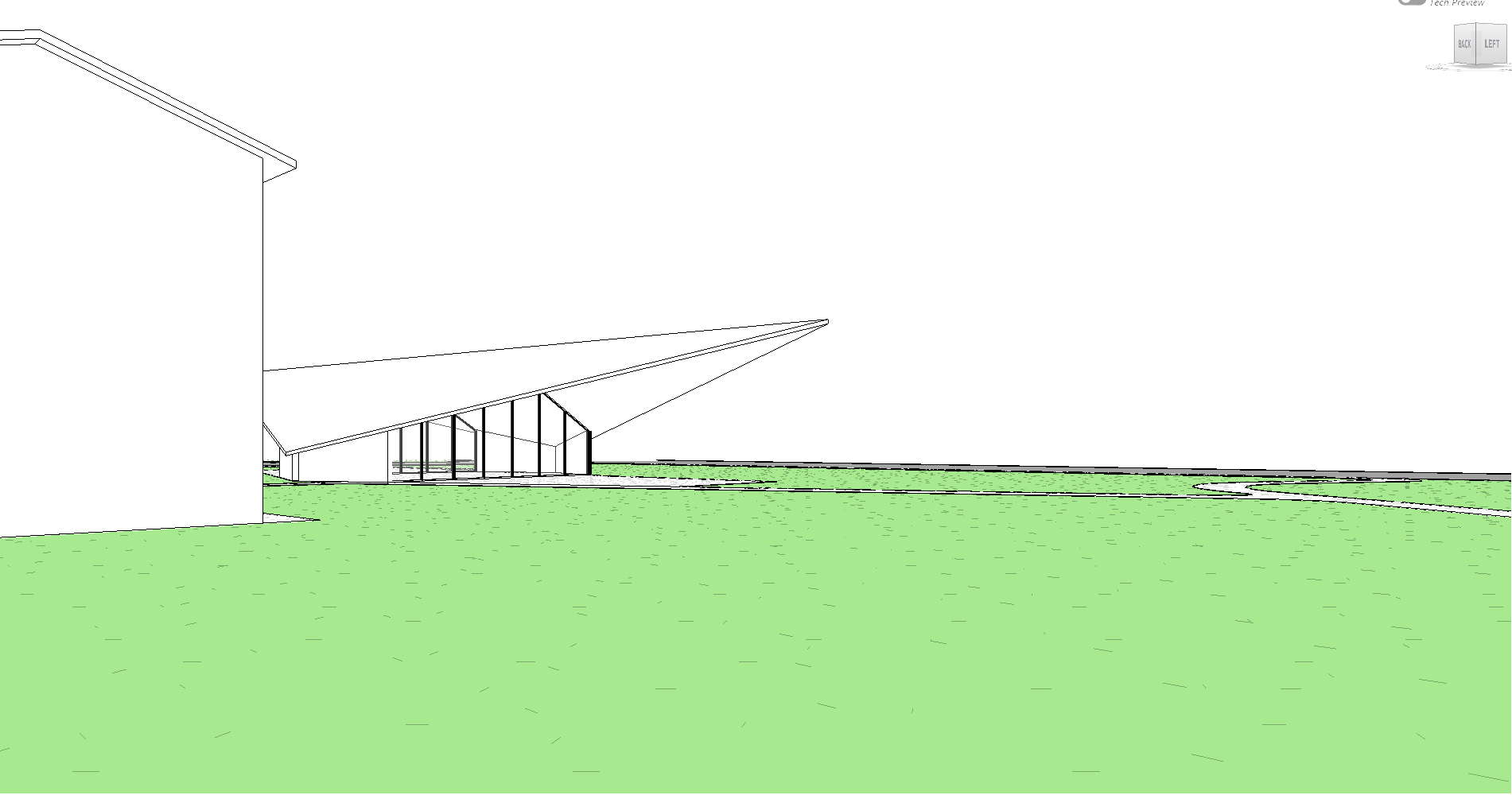 building in the front has large rock cladding on the walls a wood roof with black shingles the rear has a wood roof with black shingles and horizontal siding tree planted in the grass and lots of trees in the background