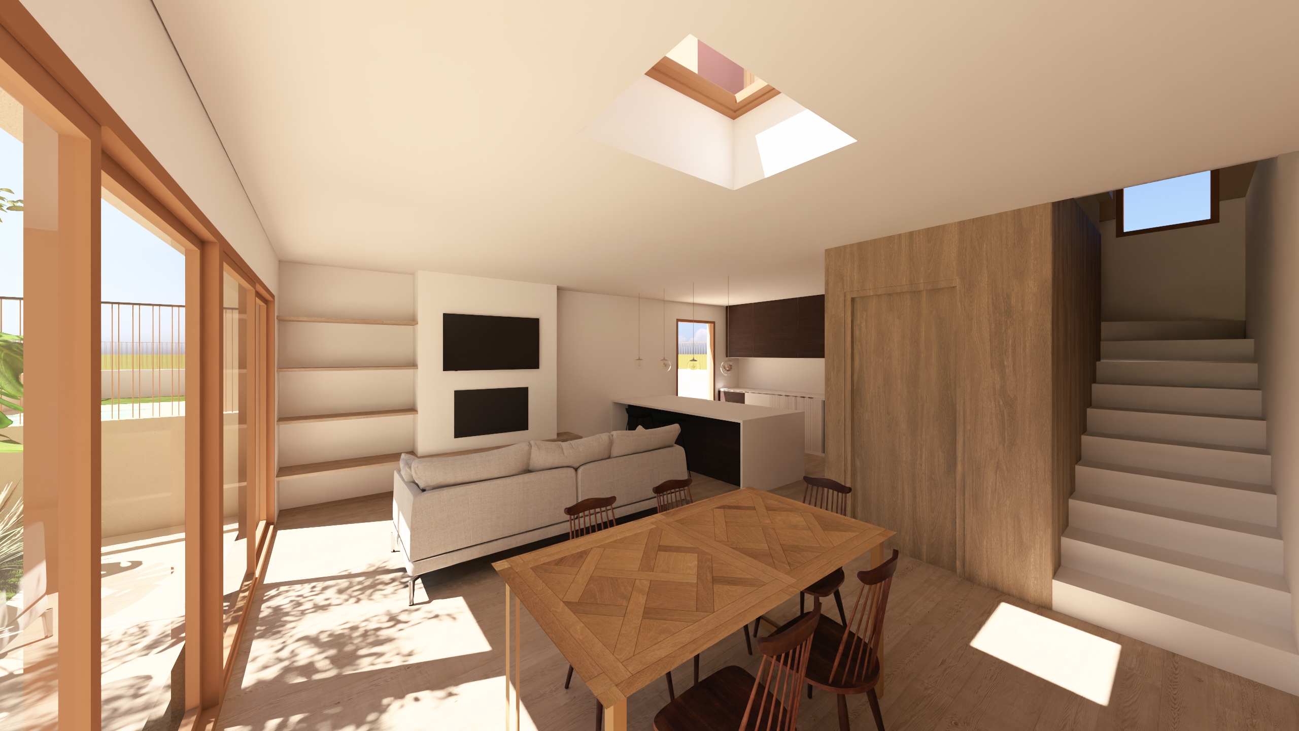 transform this interior into a warm mediterranean style home add soft translucent white or cream curtains that allow natural light to pass through creating an airy and elegant atmosphere decorate the shelf next to the television with tasteful decorative elements such as stacked books small sculptures ceramic vases and candles arranged in a balanced and aesthetic composition on the main dining living table place a beautiful centerpiece such as a ceramic bowl with natural elements flowers or candles that complement the mediterranean aesthetic modify the kitchen to reflect a mediterranean style incorporating natural materials light neutral tones warm wood accents possibly ceramic tiles and subtle rustic details that harmonize with the rest of the house add a large area rug under the living room seating area that clearly defines and covers the lounge space with textures and colors typical of mediterranean interiors soft beige sand terracotta or muted patterns adjust the lighting to a warm mediterranean ambiance with soft warm light golden tones and a cozy sunlit atmosphere that feels natural inviting and elegant maintain realism balanced composition natural materials mediterranean interior design warm tones cozy atmosphere high detail photorealistic