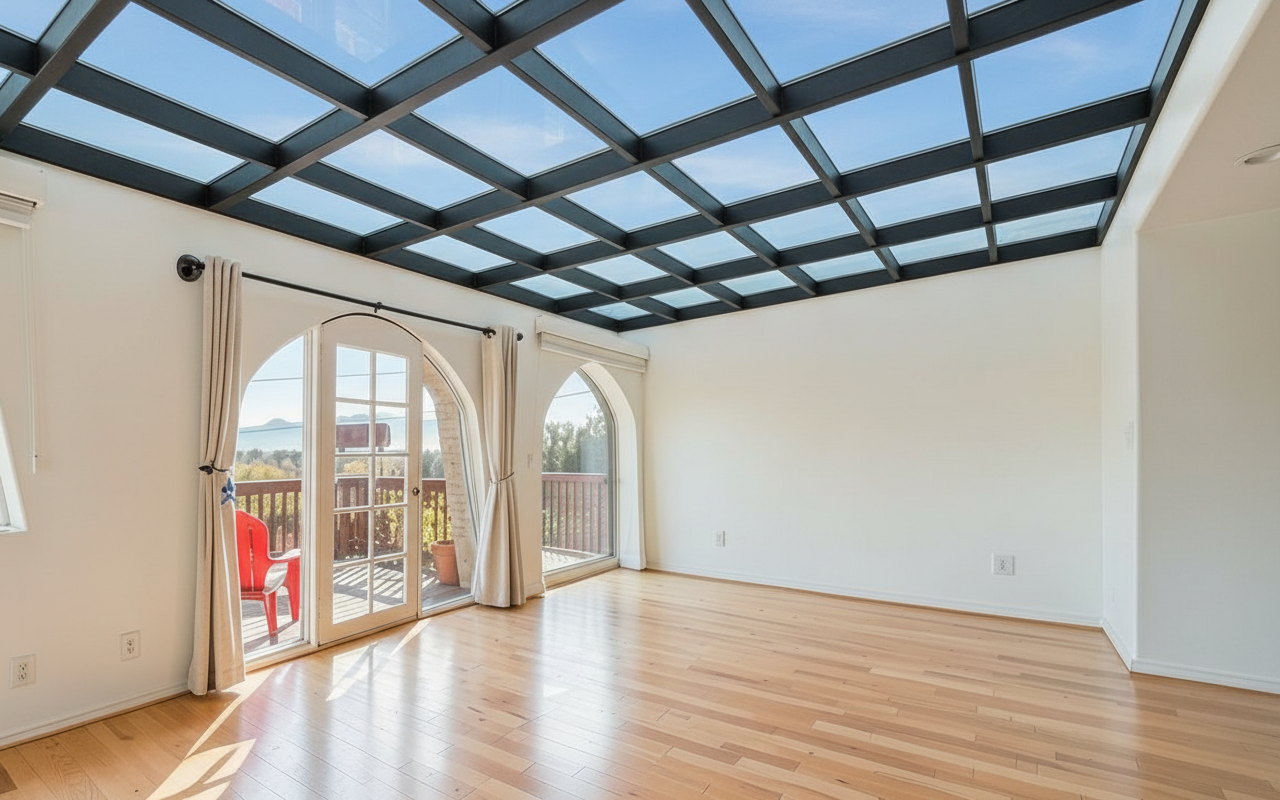 render photorealistic keeping finishes and structure the same ceiling is drywall make windows dark glass