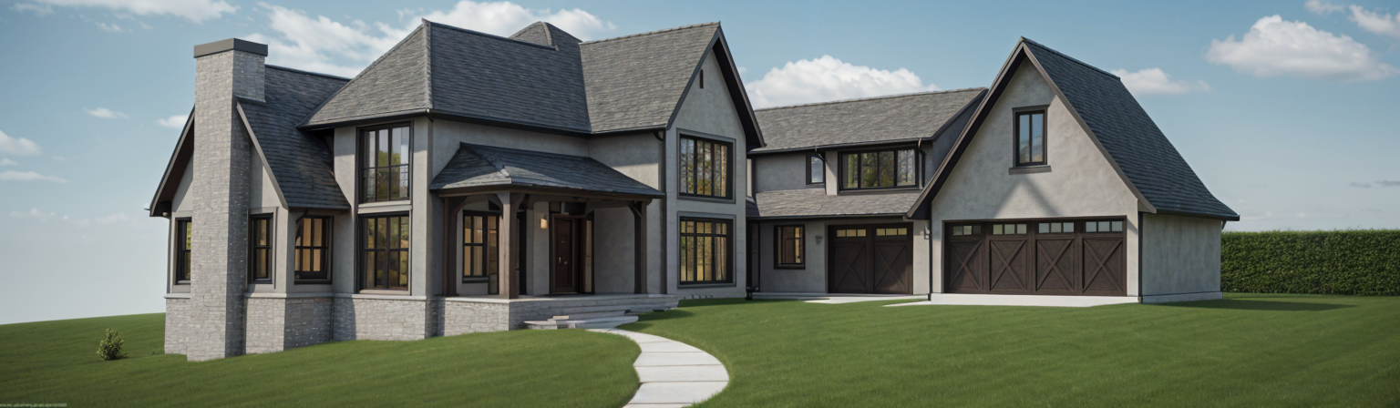 green woods low mountain soft grey stone wall a carport black golfed roof lawn around the house pool