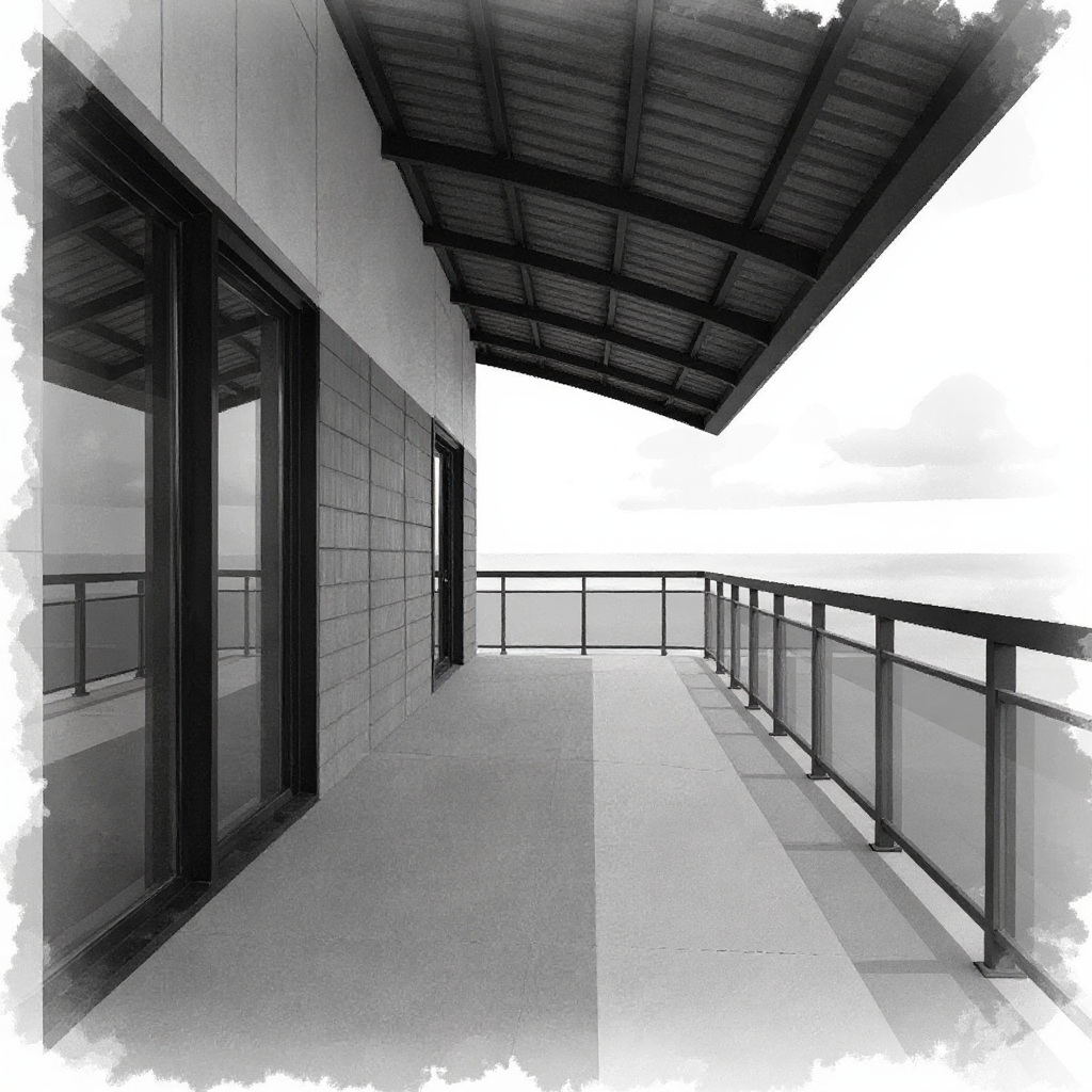 use the exact geometry from the input image do not modify simplify straighten or reinterpret any part of the building all curves surfaces and proportions must stay exactly as they are modeled this includes the curved right side balcony floor the curved right side railing the curved roof overhead all column spacing window openings and wall positions do not straighten or adjust these elements under any circumstances apply only the following stylistic changes watercolor rendering the edges of the image must bleed fade into a white page materials painted onto existing geometry only black corrugated metal roof apply a subtle watercolor rib texture to the existing roof surface without altering shape black steel framed windows on the left vertical steel panel walls faint vertical seams steel framed glass railing on the right keep its curved shape exact polished concrete floor soft smooth watercolor texture applied to the existing curved balcony floor sky atmosphere sky must be pure white with faint watercolor clouds perspective composition maintain the exact same camera view and angle shown in the input image do not reposition or reshape any architectural elements hard geometry rule most important do not straighten the right side balcony floor do not straighten the right side railing render both exactly as curved matching the input geometry perfectly render all elements exactly as they appear only the style changes