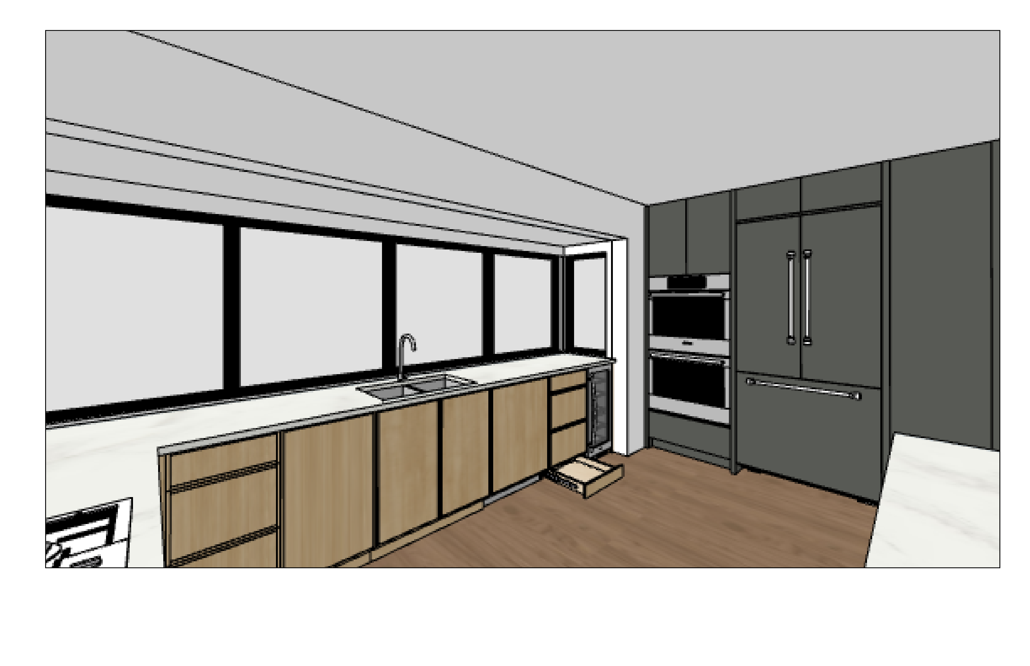 stage the kitchen as well but not too cluttered just a few items along the sink wall are 4 windows with black frames with no walls in between no grids the open drawer you see on the floor is actually a toe kick drawer for dog bowl include black cabinet handles and the faucet to be in a matte black finish above the fridge is a small 2 door cabinet but no handles because it will be push to open the tall pantry cabinet on the right side of the fridge is 1 tall cabinet with a 12 inch long black cabinet pull at around waist height no splits on the door just one tall door the cabinet above the wall oven will also have cabinet pulls the double wall oven is a stainless steel finish the door style of the wood grain cabinets is a thin shaker maintain the thin shaker doors while the gray cabinets are flat slab doors