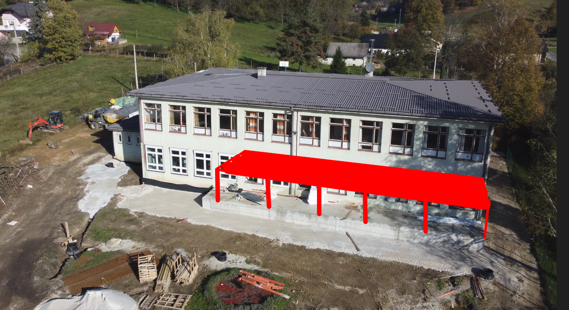 modern kindergarten building with a white facade complemented by accent architectural elements in warm brown tones white window and door frames anthracite colored roof covering in front of the kindergarten a children s playground by stribor with recognizable high quality play equipment integrated into a landscaped green area with lawns trees and shrubs a future canopy is indicated in red in the design and is planned to be executed in anthracite color matching the roof and overall architectural concept daylight scene clean and realistic architectural visualization high level of detail welcoming and child friendly atmosphere