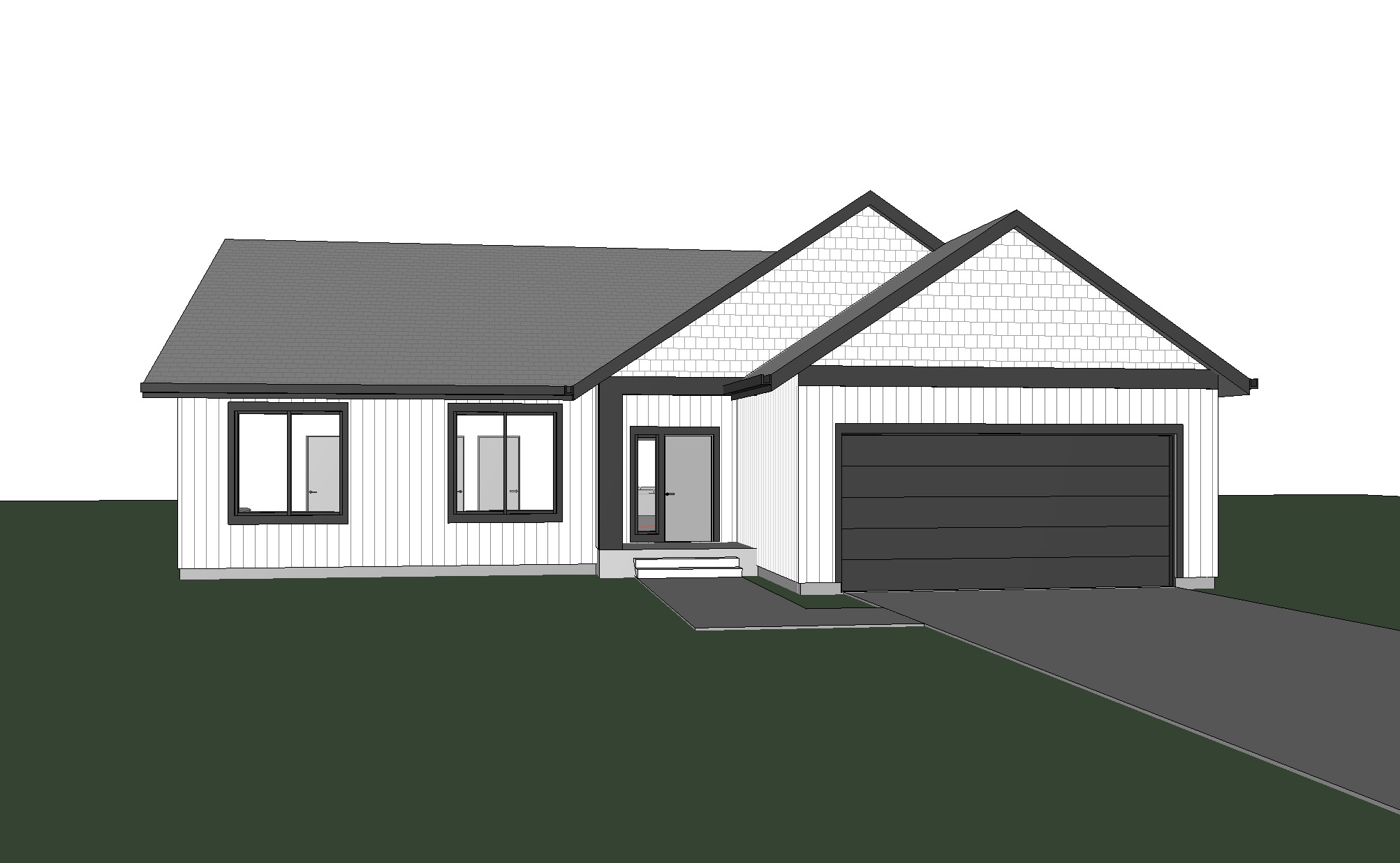 suburban house in north dakota prairie with a few trees in the background and a manicured lawn and landscaping in the front yard
