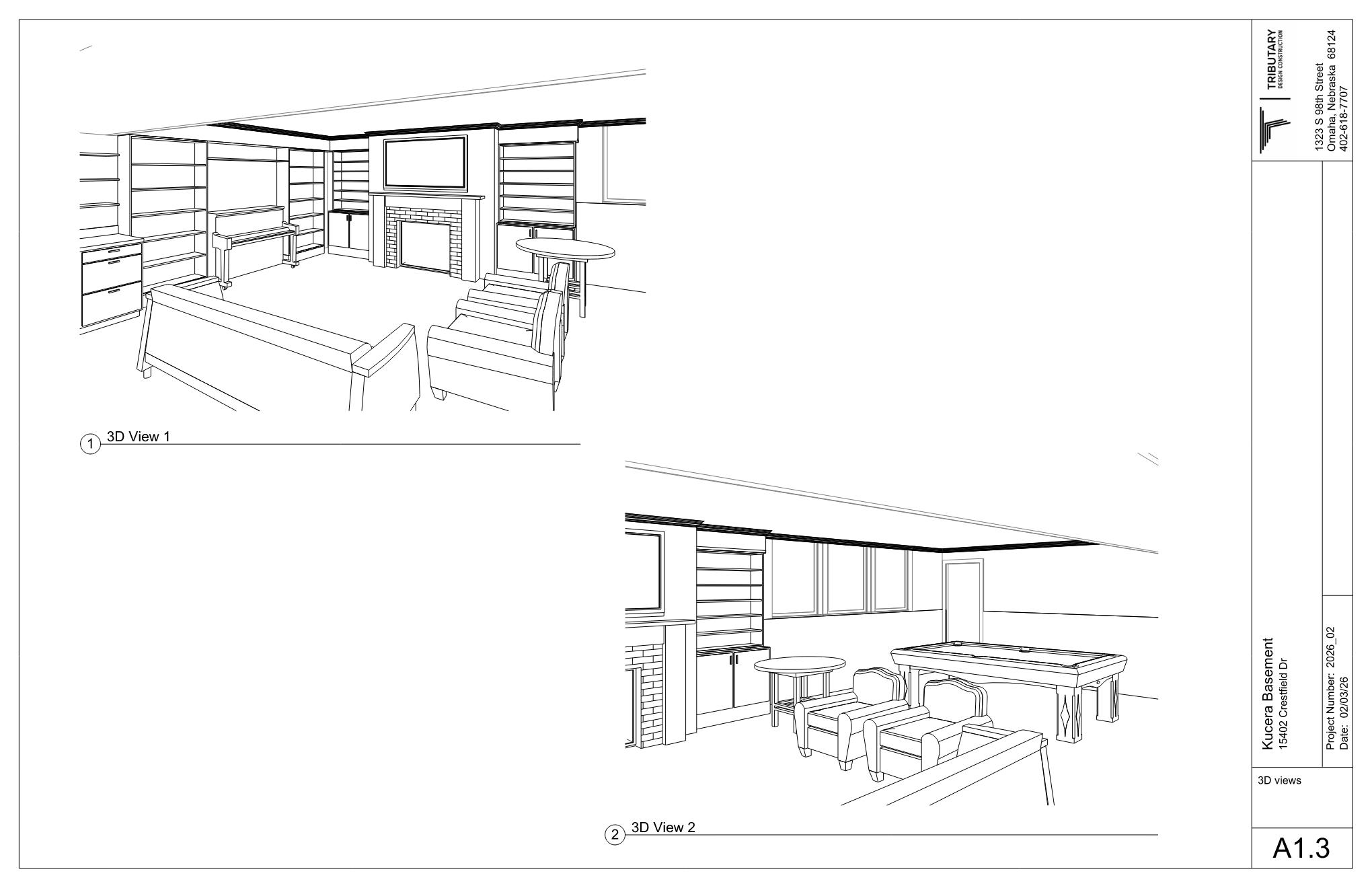 using these two views of the room make one rendering with olive green cabinetry medium brown wood floors large persian area rug leather furniture
