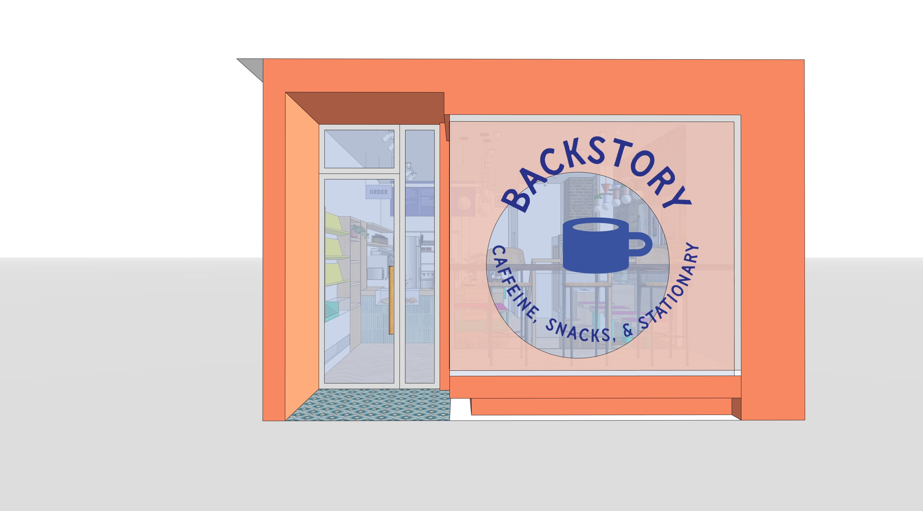 this is an exterior view of a coffee shop storefront do not change anything in the image just show warm white light coming from the interior and site the building on a city street surrounded by beige buildings that would be seen in anchorage alaska the storefront window is covered with a translucent peach sticker with a circular cutout in it as shown keep the logo on the storefront the same color that it is in the mockup
