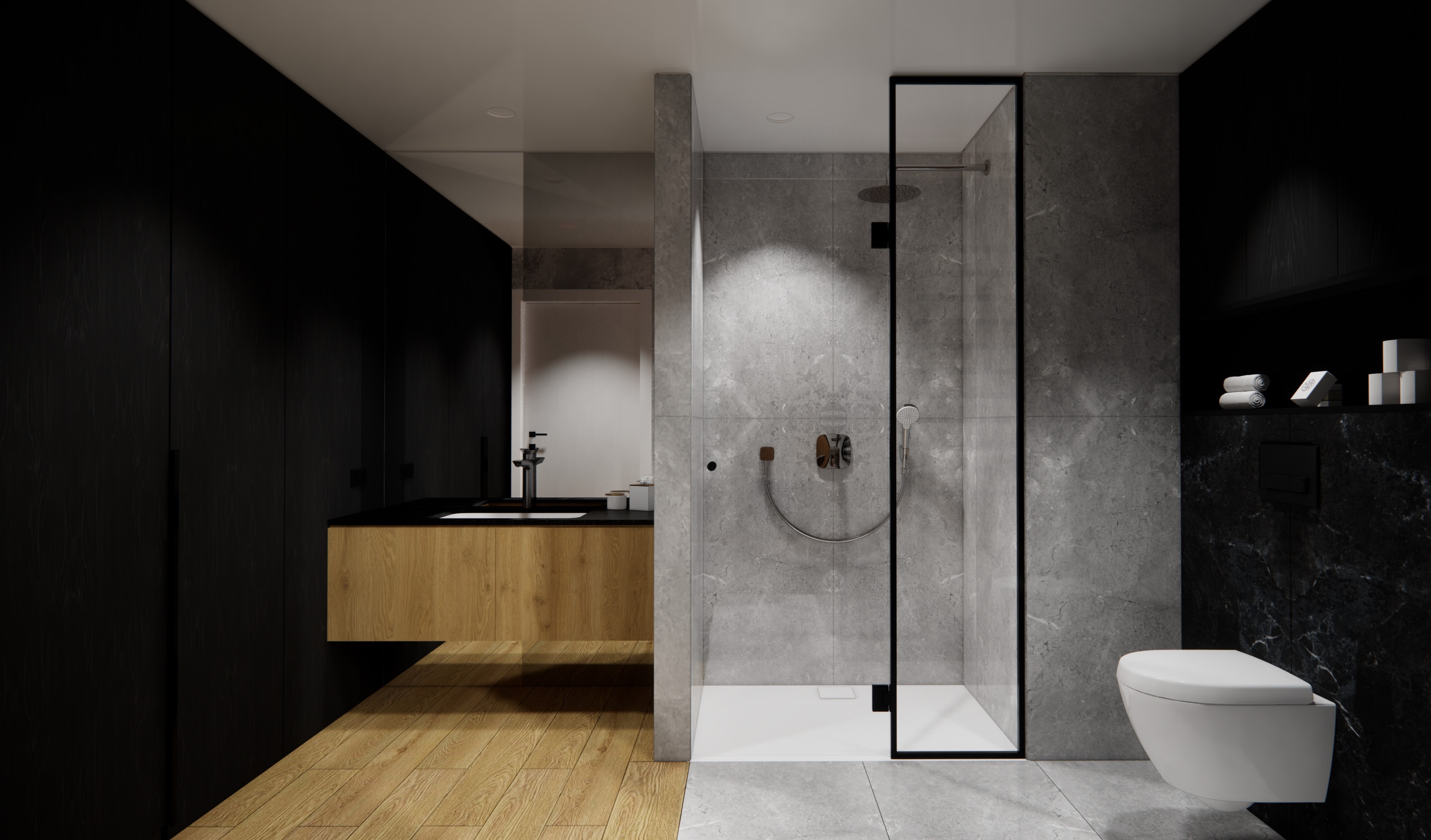 create a photorealistic image add lighting replace materials with photorealistic real materials add some slight reflections and shines to materials insert an ies light cast replace soft materials and cloths for high end real like materials add a person to the image girl in beige bikini taking shower motion blurred as a long exposure