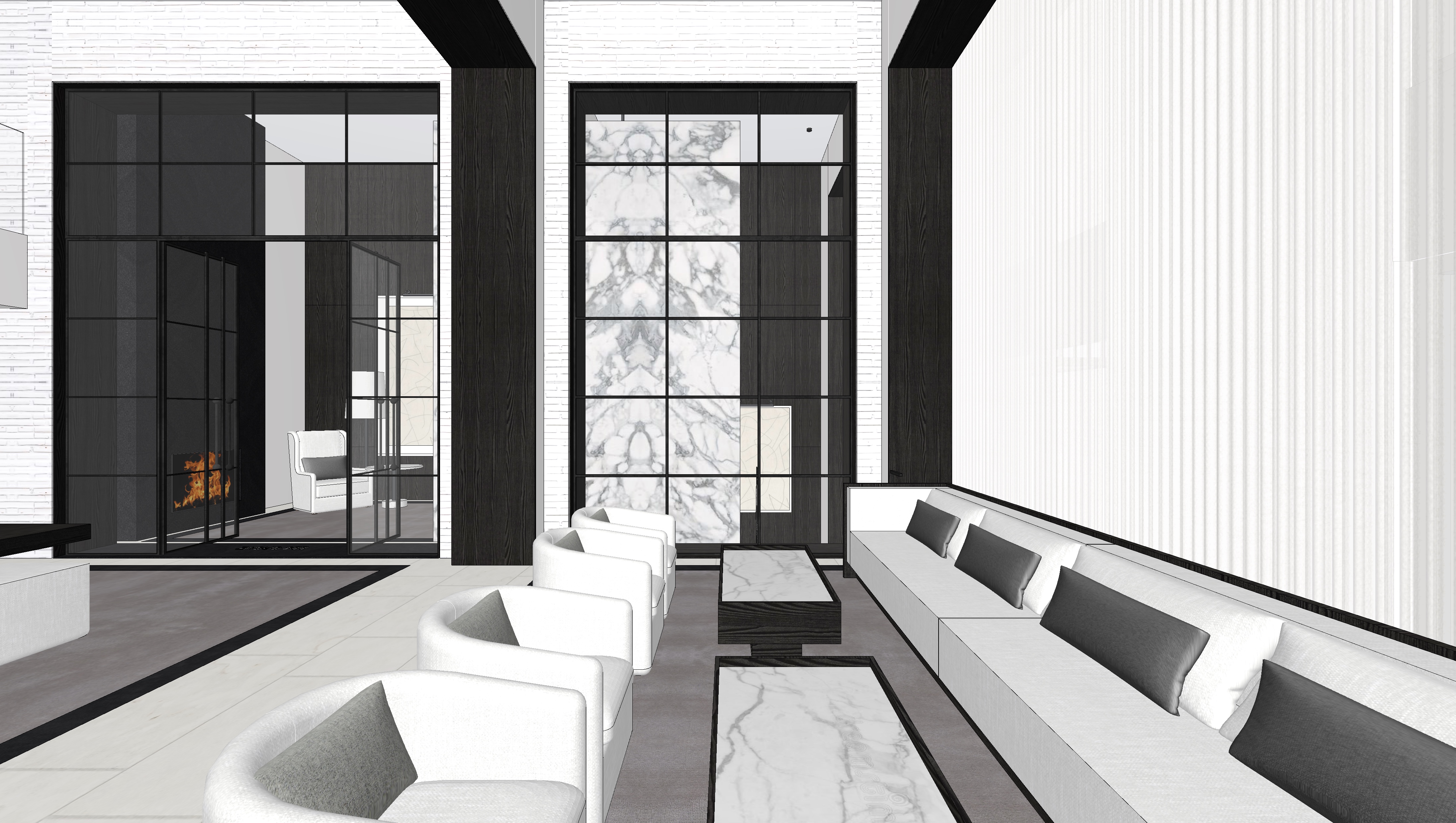 render a fully photorealistic nighttime version of this contemporary double height lobby maintain the exact architectural geometry proportions materials furniture placement ceiling heights window divisions fireplace location reception desk mezzanine and camera perspective do not alter layout scale or design only enhance lighting and realism scene overview a modern double height luxury lobby with a mezzanine level marble reception desk on the left black stained vertical wood panels white brick accent wall on the right large steel framed glass wall with fireplace and a central console table with orchid arrangement four sculptural white lounge chairs are positioned in the foreground lighting design nighttime atmosphere white sheer draper on the right is backlit with warm white light coming from behind the sofa exterior is dark with faint subtle reflections in the glazing the fireplace glows warmly and becomes a strong focal point interior lighting layers warm 2700k 3000k ceiling downlights recessed architectural downlights emit soft warm pools of light subtle beam spread with realistic falloff no overexposure or harsh hotspots feature wall vertical wood panels add concealed uplighting at the base of the dark wood panels to emphasize height and texture light should graze the grain subtly reception desk introduce a soft underglow at the base of the marble reception desk marble veining should catch light with subtle reflectivity fireplace flames should feel realistic warm and dynamic firelight should cast soft flickering reflections onto the adjacent glass and dark wood paneling subtle glow on nearby floor tiles central console table soft overhead accent light highlighting the orchid arrangement gentle shadow beneath the table foreground lounge chairs soft ambient illumination with subtle shadow gradients fabric texture clearly visible but not overlit materials realism marble satin finish with natural veining and slight reflectivity dark wood panels deep espresso tone visible vertical grain matte to low sheen finish white brick wall subtle texture soft grazing light steel window frames dark bronze or black metal with realistic reflections flooring large format light porcelain or limestone tile with soft reflection and shadow realism area rug soft woven texture with natural light absorption