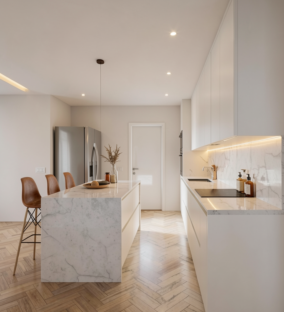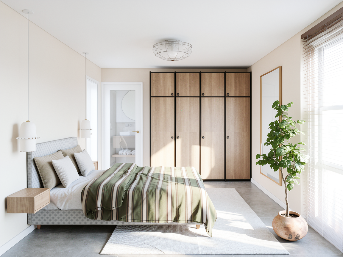 create a realistic interior room led on the mirror on the right light oak wood with grey undertones wood where the radiator is on the front t ambient light light oak wood with white grey undertones smooth and fresh room the wall where th headbed and the vanity is are off white walls on the right and the left