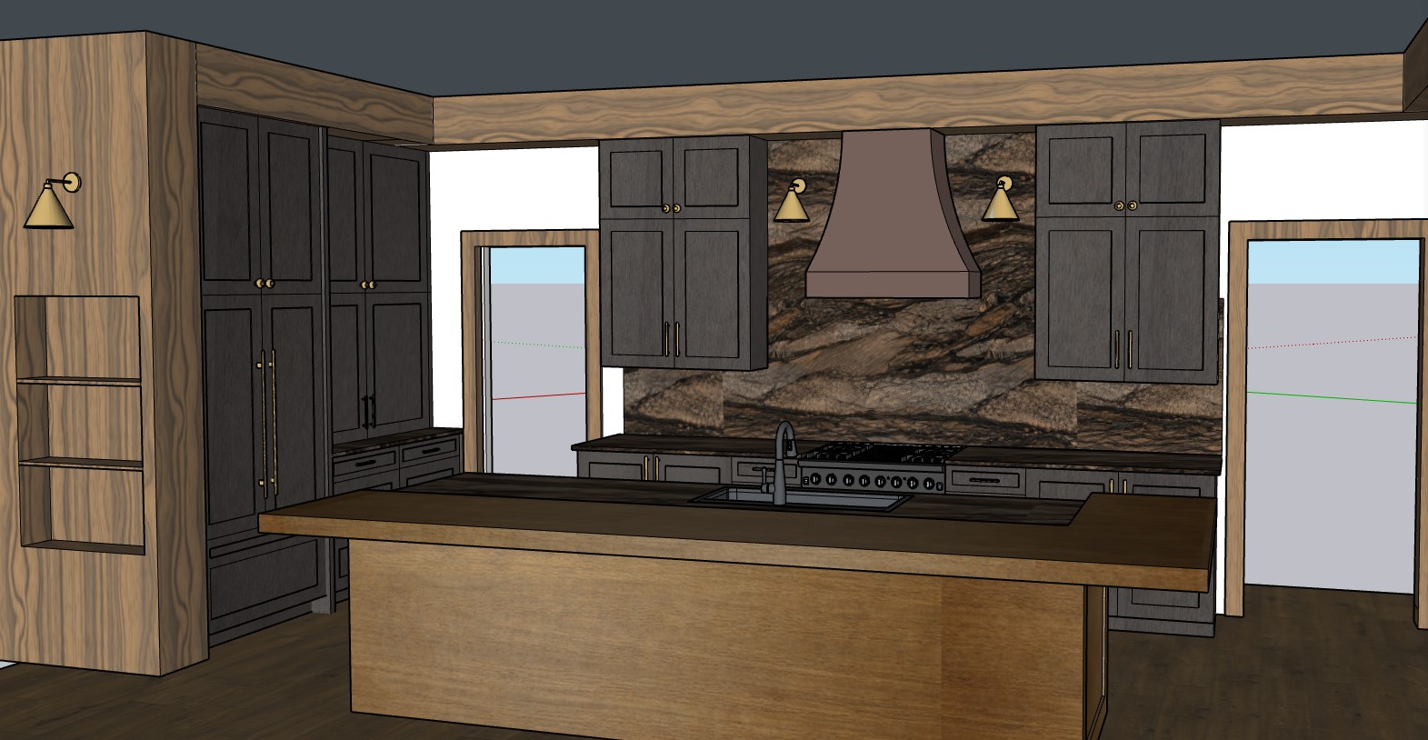 the hood is a brushed copper metal with a soft natural patina maintain its exact tone and shape the island is a medium caramel wood tone with visible grain keep the warmth and depth consistent all perimeter cabinets are a deep black stained wood with visible wood grain the grain must clearly show through not painted not flat black maintain the contrast between the dark perimeter cabinets and the warm toned island important the full perimeter cabinetry must be completely visible in the render do not crop obscure or truncate any perimeter cabinets show all runs of cabinetry clearly and in full doorways important both side doorways should lead into small adjacent rooms not blank or exterior space these rooms should feel cohesive with the kitchen by using coordinating warm earthy tones no bright white or stark contrast pull colors from the kitchen palette warm wood tones soft browns muted neutrals so the transition feels natural and intentional keep lighting in these rooms soft and warm slightly dimmer than the kitchen for depth lighting all sconces must have visible downward facing light downlighting casting a warm glow onto the backsplash lighting should be warm and realistic enhancing materials without washing out color additional instructions show all perimeter cabinetry clearly with no cropping or shadow obstruction keep backsplash flooring trim and architectural details exactly as shown maintain a high end real life rendering style not overly stylized or dramatic preserve hardware finishes and placement make the space brighter and the sconces have a downlightdo not turn island into stonedo not remove wood graindo not flatten cabinet color to pure blackdo not crop cabinetrydo not overexpose lightingdo not simplify materials countertop description apply only to tops polished exotic granite with dramatic horizontal flowing veins deep charcoal black warm brown bronze and gold tones organic layered movement with high contrast medium to large scale veining subtle polished finish not overly glossy natural stone variation with fine mineral detail apply only to areas shown not the walls not the second level on the island