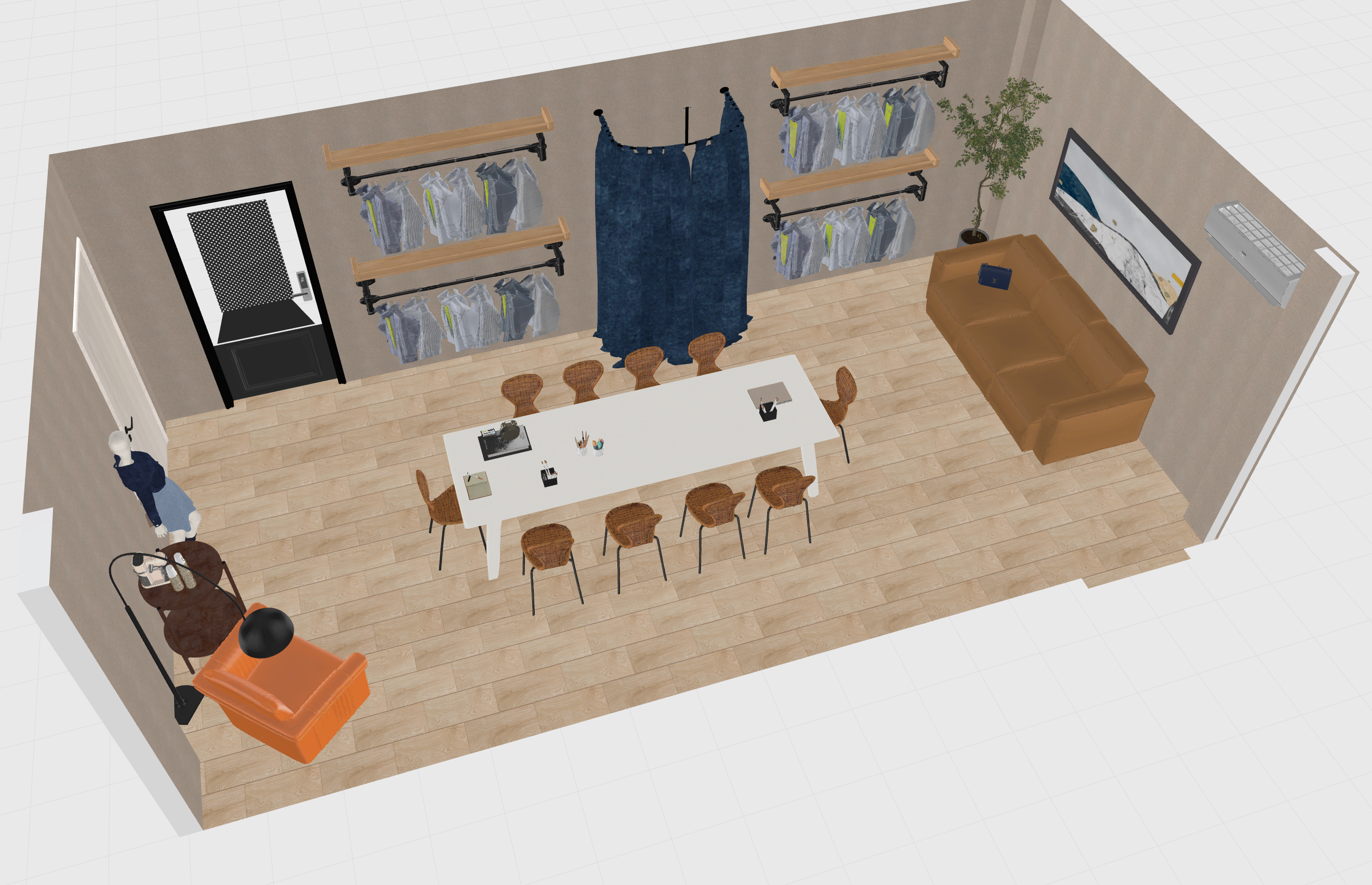 create a realistic effect of a sample room meeting space for a clothing company let the light naturally enter through the windows the sofa and armchair are the same brown leather color as the classic italian sofas from the 1970shigh end interior design hyper realistic textures 8k resolution cinematic lighting minimalist aesthetic sharp focus ad some decorations and some details as ad magazine style