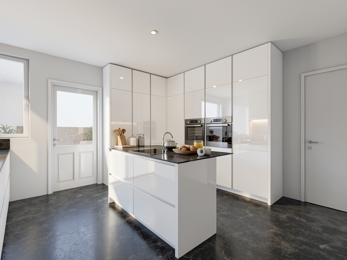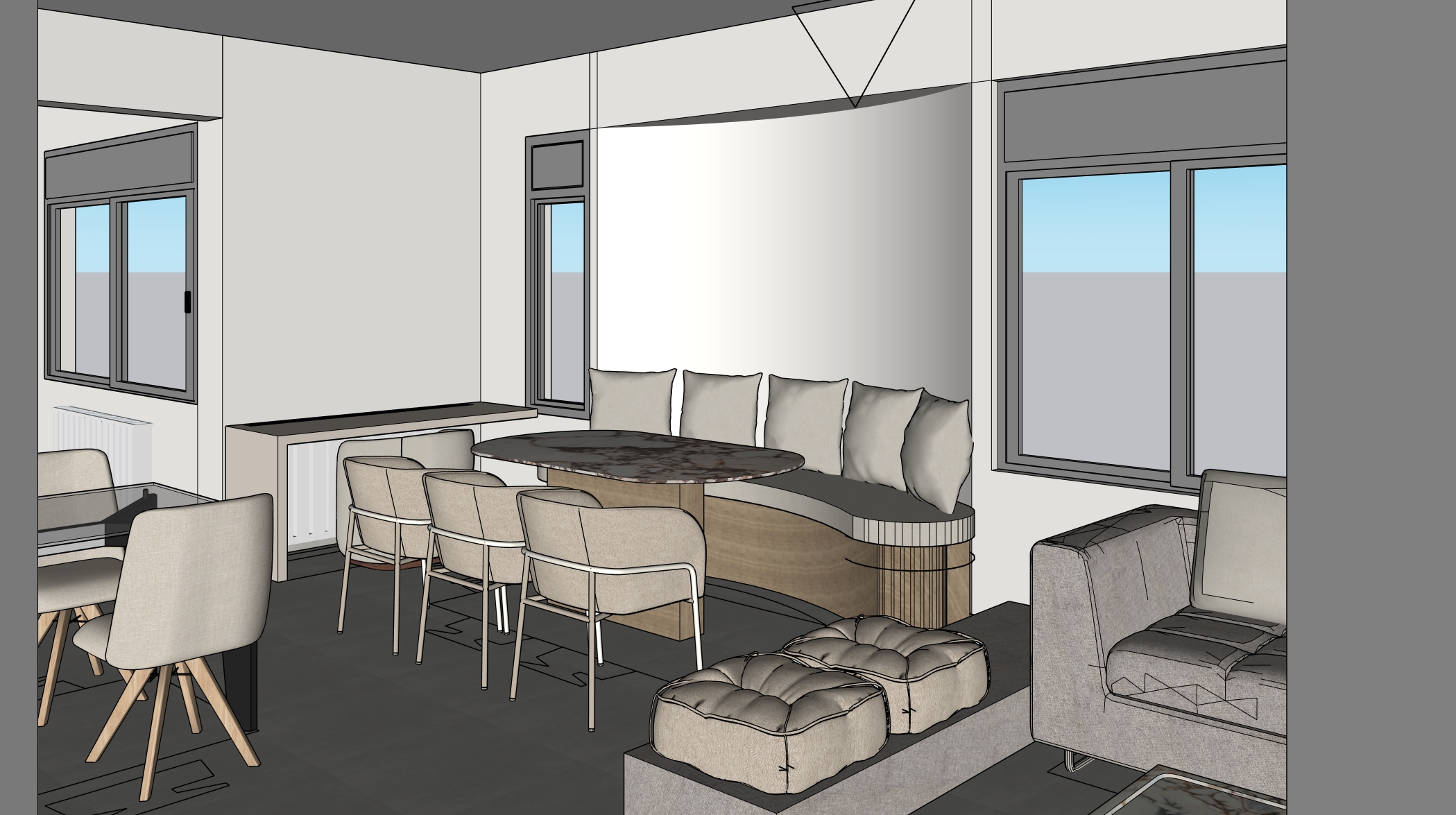 a modern minimalist interior design in a warm inviting atmosphere use soft beige walls white soft ceiling color wood curverd bench with beige pillows the dining chairs are upholstered in light beige for a cozy touch paired with a marble table supported wood leg the floors have a polished gray finish natural light floods through the window casting soft warm shadows creating a serene and elegant environment a light beige office next to the dinning area