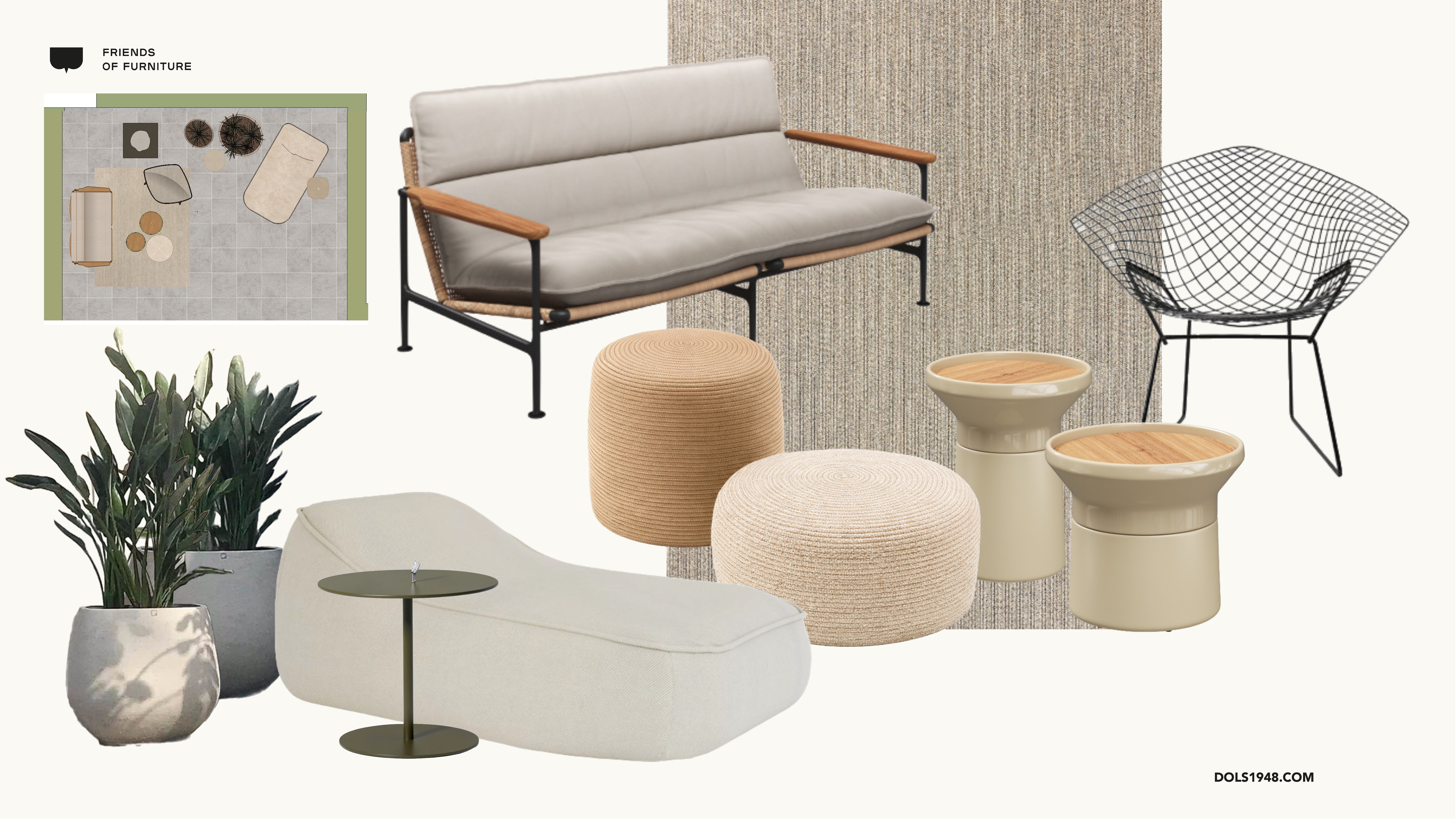 maak een terras met de meubels op de afbeelding links boven zie je een 2d grondplan van de indeling van het terras deze moet je niet gebruiken in de staging maar is louter als extra informatie de groene vlakken zijn lage struiken die aan 3 zijde van het terras aanwezig zijn gebruik de meubels en afwerkingen zoals op de afbeelding weergegeven maar maak een leuke compositie hiervan