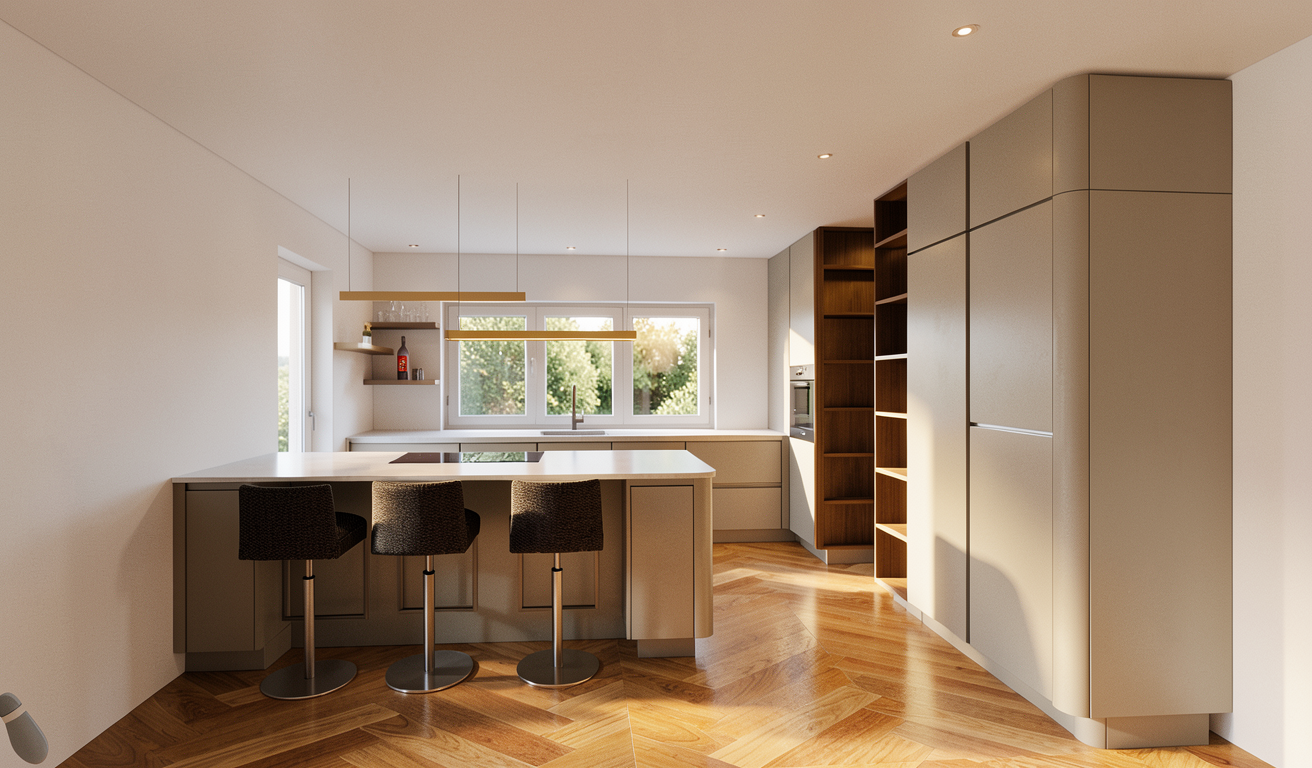 render this make the fitted furniture light cream in colour make the internal walls white make the flooring light grey carpet
