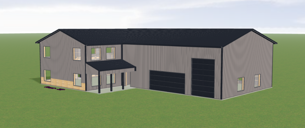 can you make this look more realistic as if taken by a camera add some rural trees in the background and make the yard look nice add a concrete driveway in front of the garage and porch