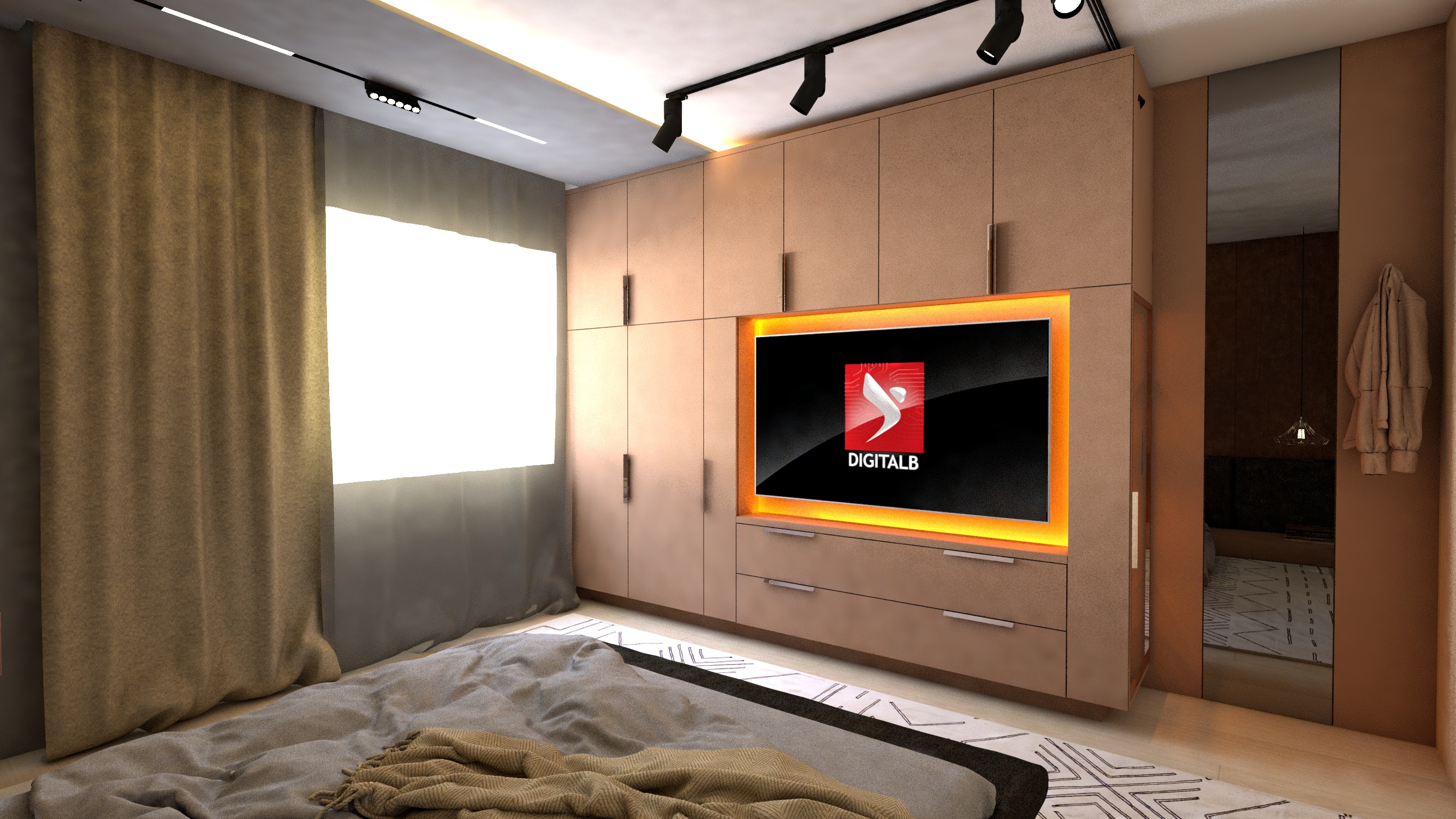 this is an already finished interior render do not change the design layout materials textures or colors keep all existing materials exactly as they are and respect the original palette your task is only to enhance realism and harmonize the scene preserve all original textures and materials and improve their visual realism without replacing or modifying them important material details that must remain unchanged the headboard of the bed and the bench seat at the foot of the bed are made of dark leather the wall surface behind the headboard has a corten steel imitation texture the furniture is in earthy brown tones enhance material realism shading and surface depth while keeping the same textures and colors improve contact shadows reflections and natural light interaction with the materials introduce natural sunlight entering the interior through the windows creating soft daylight gradients and realistic shadows across the room ultra photorealistic architectural visualization quality physically accurate lighting ray tracing global illumination realistic reflections subtle imperfections natural material variation architectural photography style eye level camera 35mm lens depth of field 8k render please let sunlight to enter interior and some some realistic texture for the carpet preserve original materials and textures enhance realism only no redesign natural material variation subtle imperfections realistic lighting